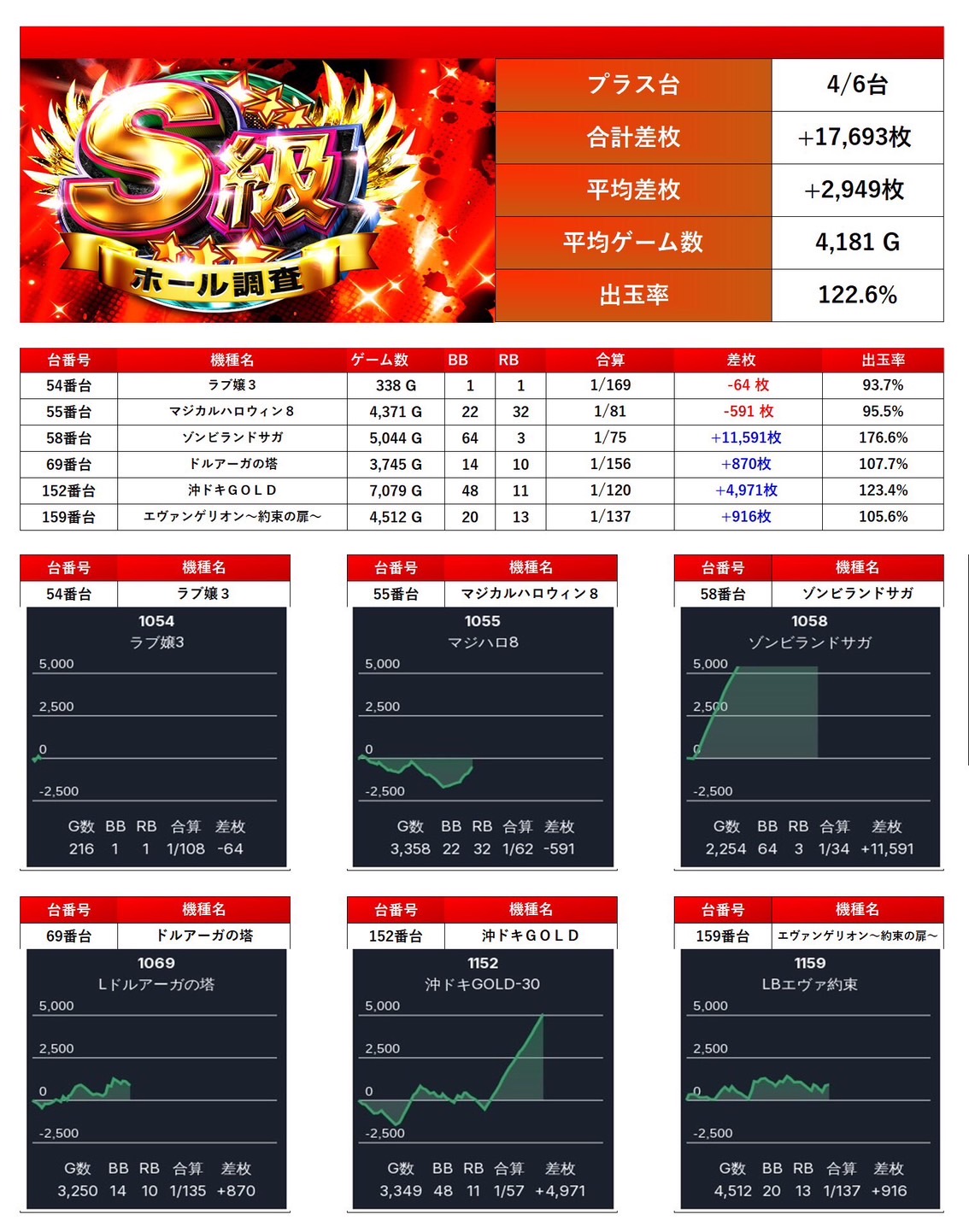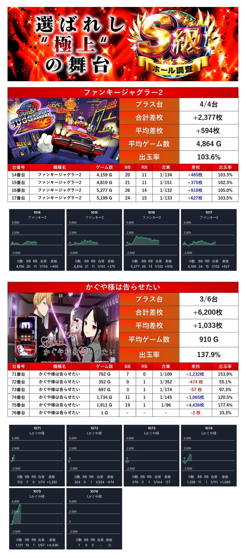 32回目となったS級‐赤‐は店内全体でpick up率は15.7%にも及び、メイン機種を軸に安定した仕掛けが展開されていた。全台系での「かぐや様は告らせたい」、ニブイチ機種では「からくりサーカス」が回転数が少なくポテンシャルを発揮できずに終えてしまったのが悔しい。ユーザーからの信頼に応えれるよう、これからの営業に期待している。