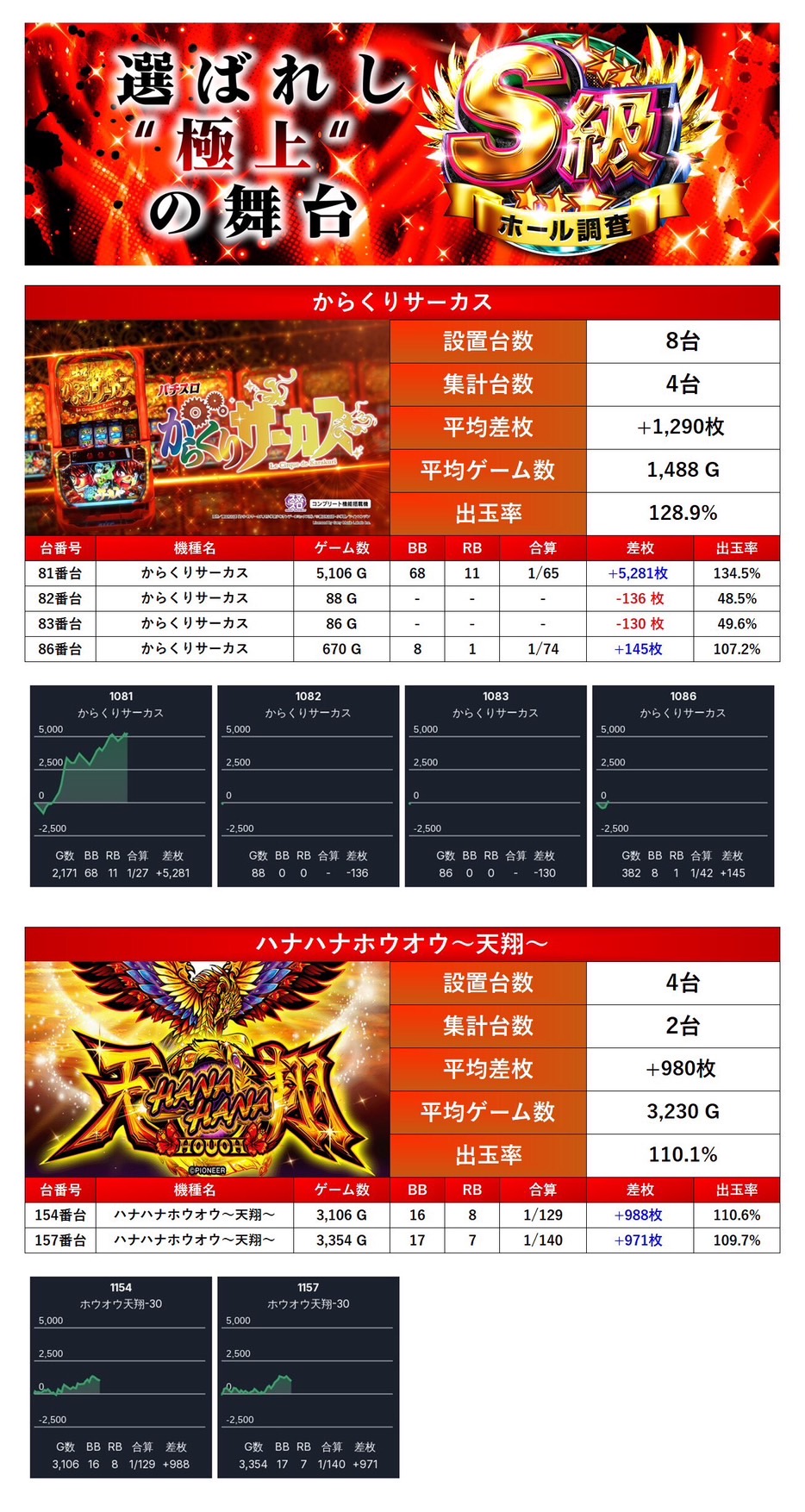 「からくりサーカス」「ハナハナホウオウ~天翔~」の2機種6台をpick up。平均差枚+1,187枚、平均出率119.1%だった。