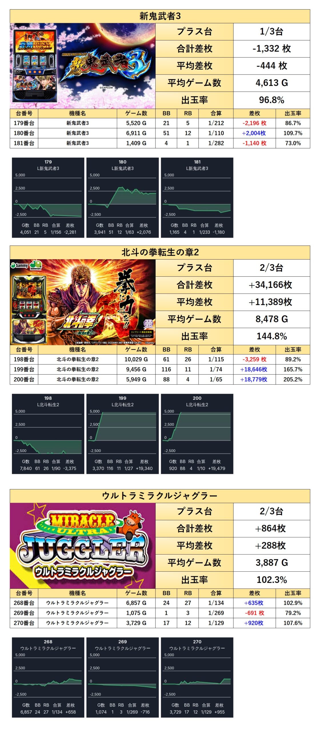 北斗転生、新鬼武者3、ミラクルジャグラーの3機種が全台仕掛け。