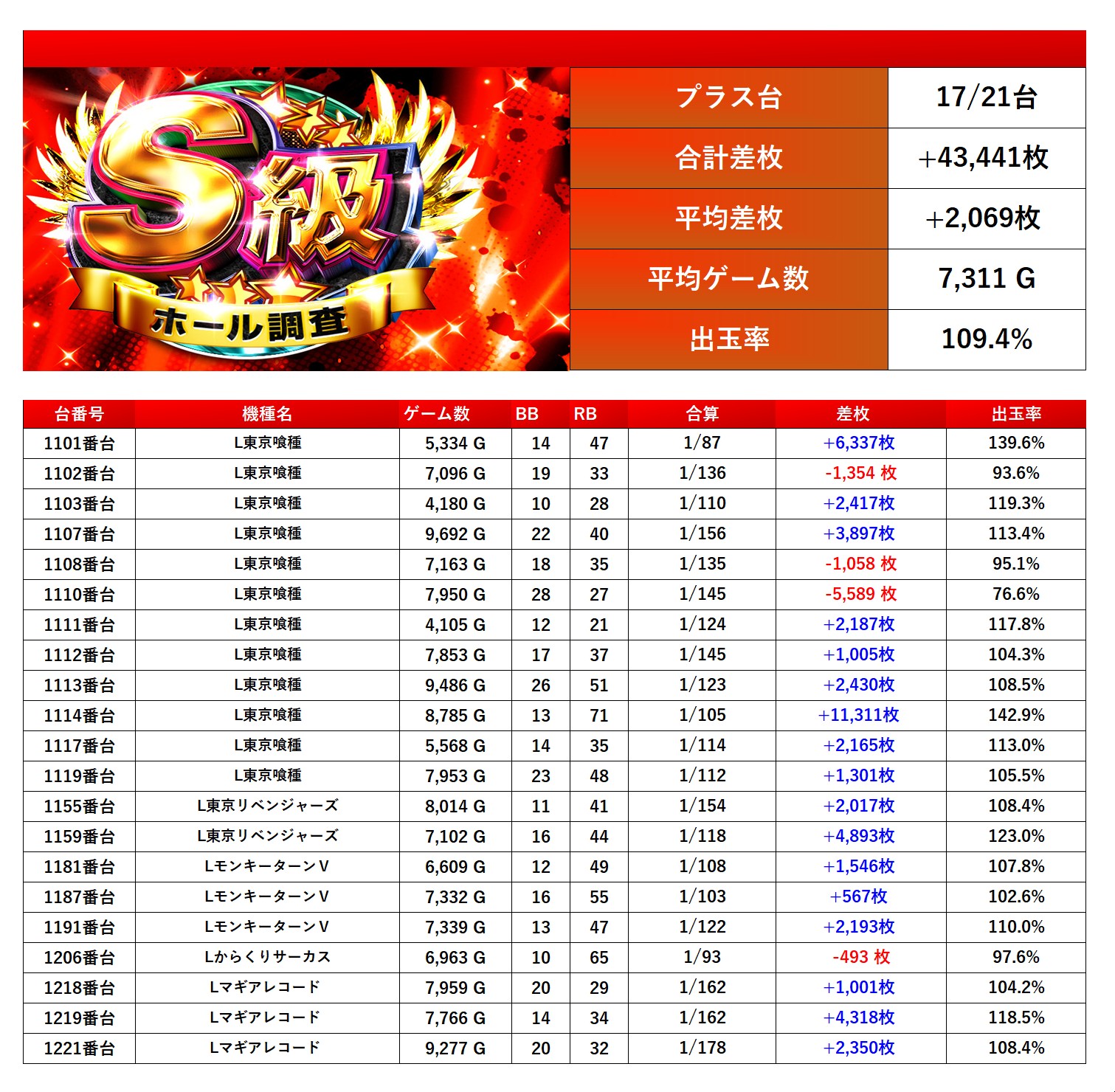 「東京喰種」「モンキー」「マギレコ」「東京リベンジャーズ」「からくり」から優秀台を21台pick upする。21台の平均差枚は+2,069枚で平均出率が109.4%。