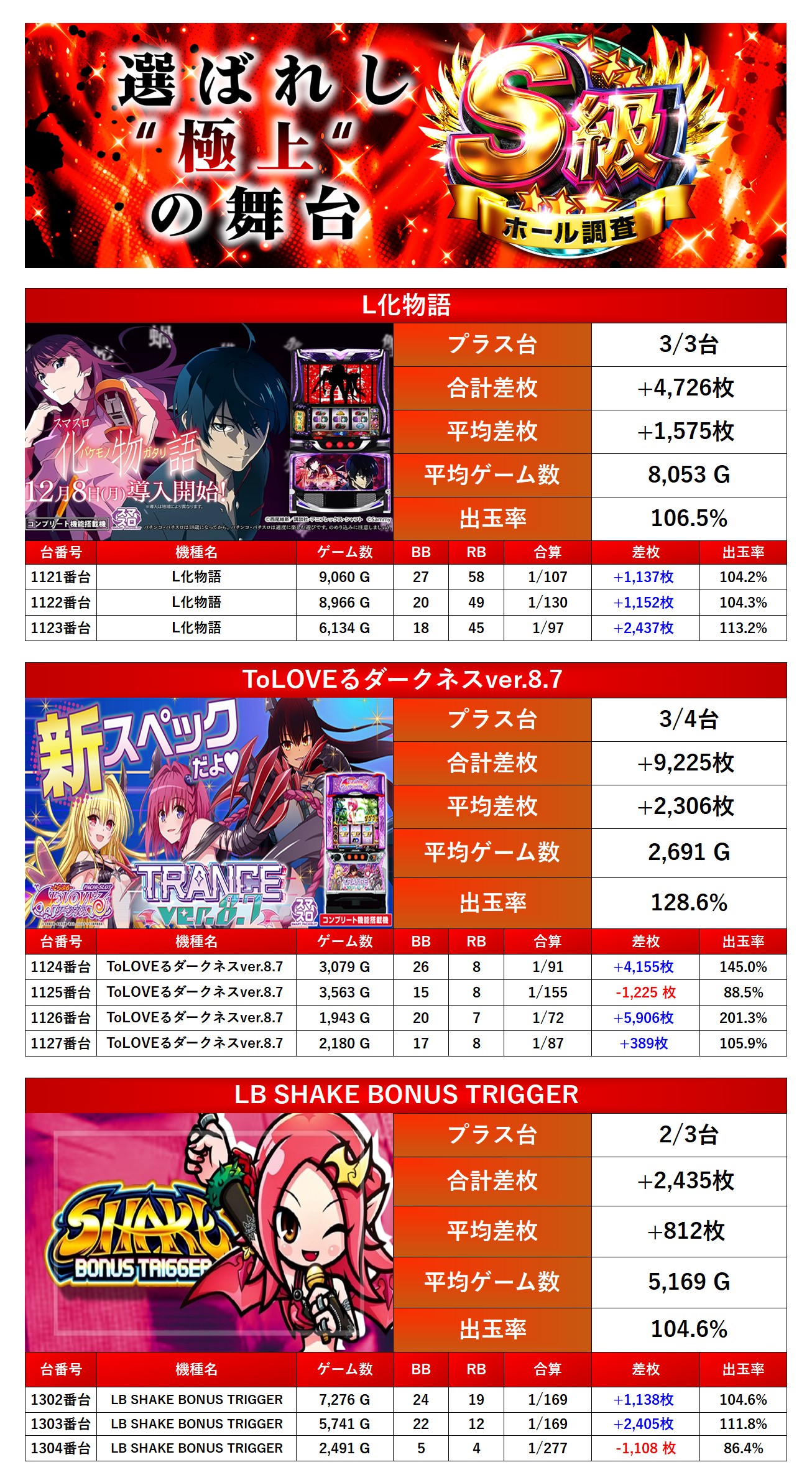初開催となるS級調査-赤-では全体からpickup率17.4%が仕掛けられていた。「メイン機種」では17/21と勝率が高く出率も素晴らしい。「全台系」ではしっかり打ち込まれ出率も安定していた。「ニブイチ仕掛け」ではメリハリな仕掛けながらもプラス域をしっかり確保し、ホールの出率を盛り上げる要因となっていた。「2台以下設置機種」、「法則に捉われない台」ではスマスロからAタイプまで多彩な機種がpick upされていて打ち込みやすい台の用意がありどんな抽選番号でもチャンスがあると思わせてくれるラインナップにもなっていたが、今回は分岐に到達できず二つ星評価となった。次回の調査も期待している。