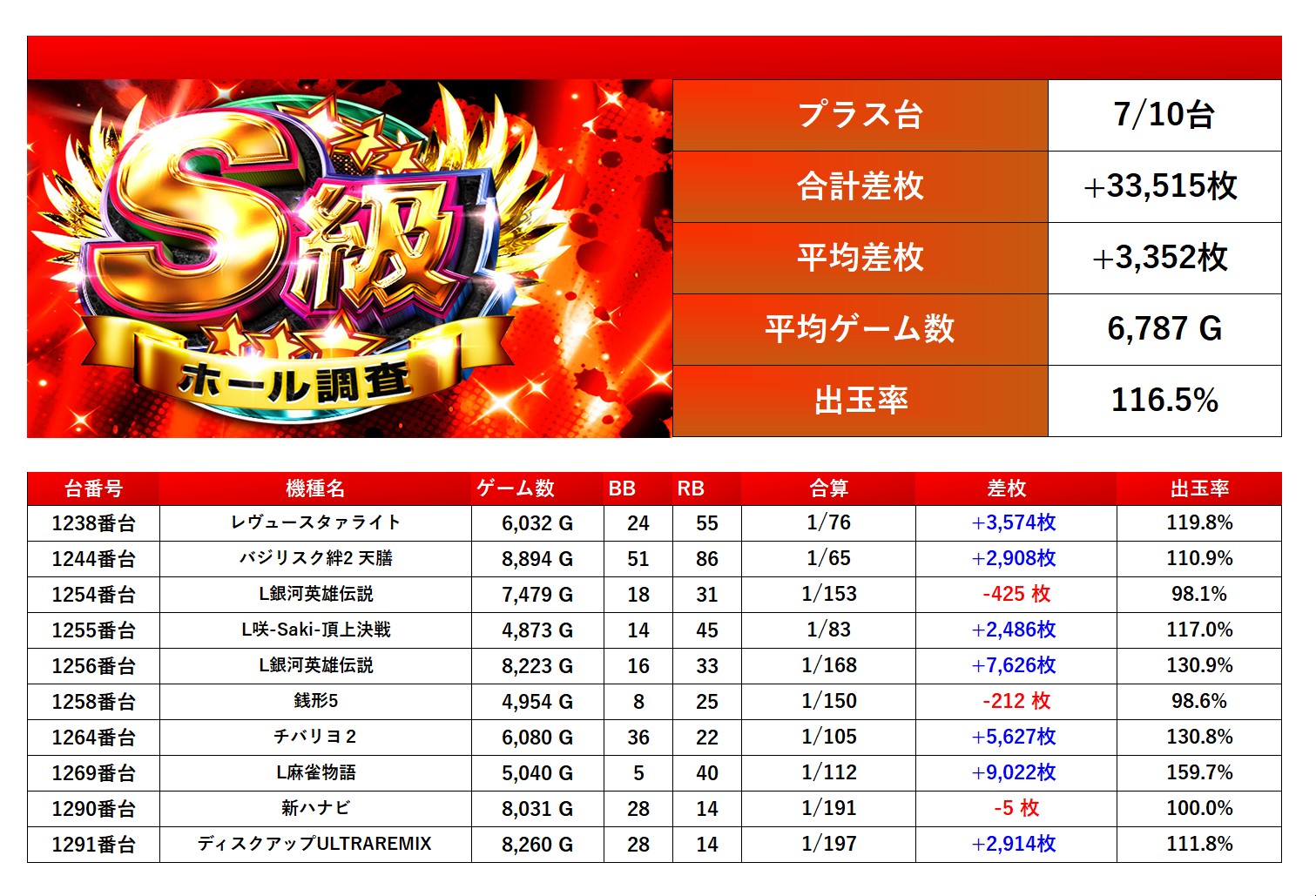 対象から10台をpick upする。10台の平均差枚は+3,352枚で平均出率が116.5%と勝率も高く爆発的な出玉で存在感を放っていた。
