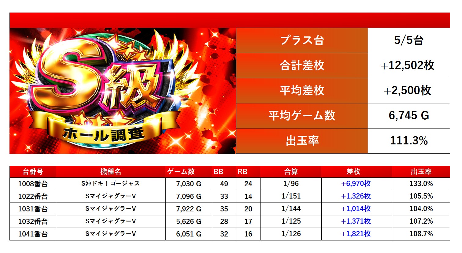 対象から5台をpick upする。5台の平均差枚は+2,500枚で平均出率が111.3%だった。