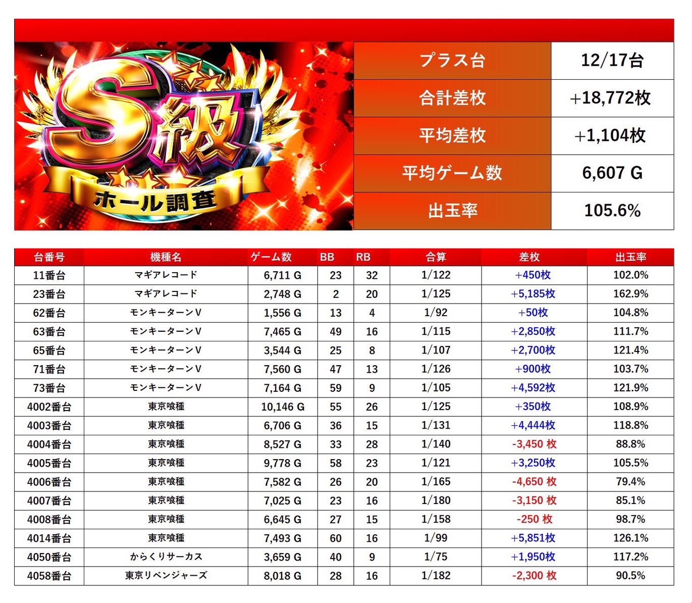 「マギレコ」「モンキーターン」「からくり」「東京リベンジャーズ」「東京喰種」から最優秀台を17台pick upする。平均差枚は+1,104枚で平均出率が105.6%と安定した数値を記録。
