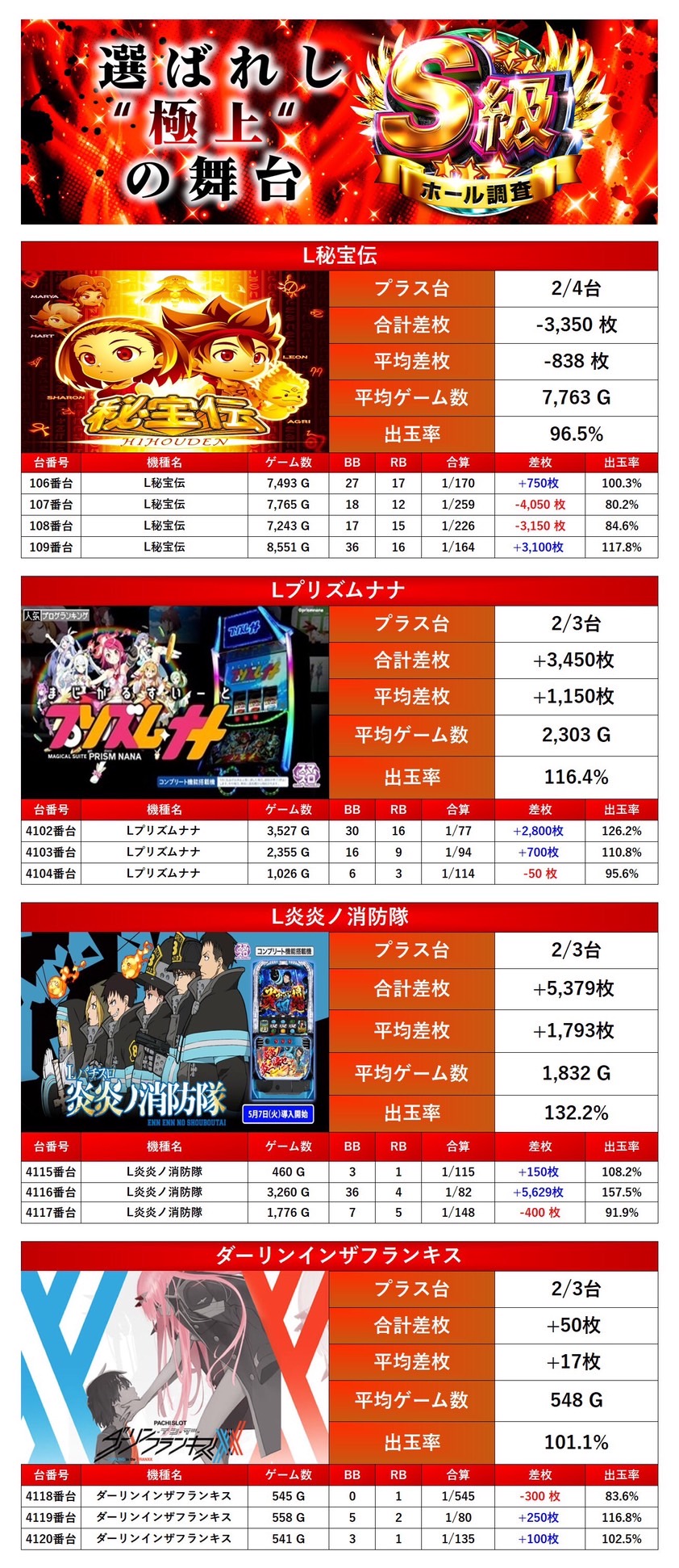 「L秘宝伝」「Lプリズムナナ」「L炎炎ノ消防隊」「ダリフラ」の4機種をpick upする。4機種13台の平均差枚は+425枚で平均出率が104.0%で打ち込みが足りない台や、下振れした台もあるが安定していた。