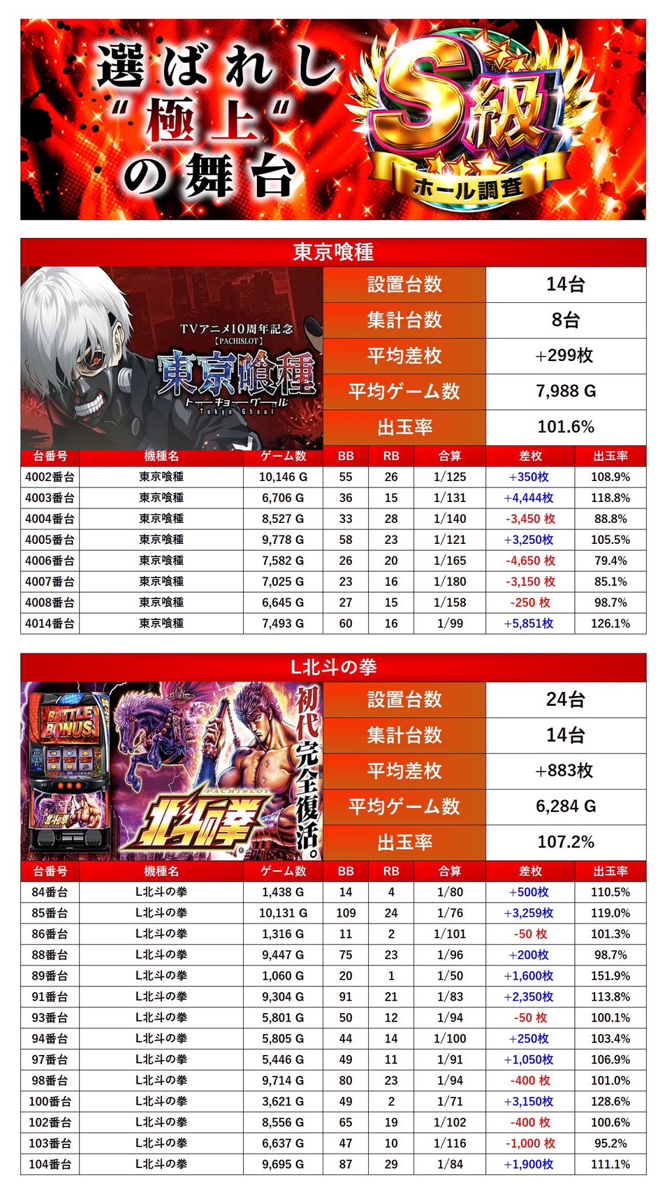 最優秀台でも紹介した「東京喰種」さらには「北斗の拳」の2機種をpick upする。2機種22台の平均差枚は+671枚で平均出率が104.8%と多台数が対象となった。