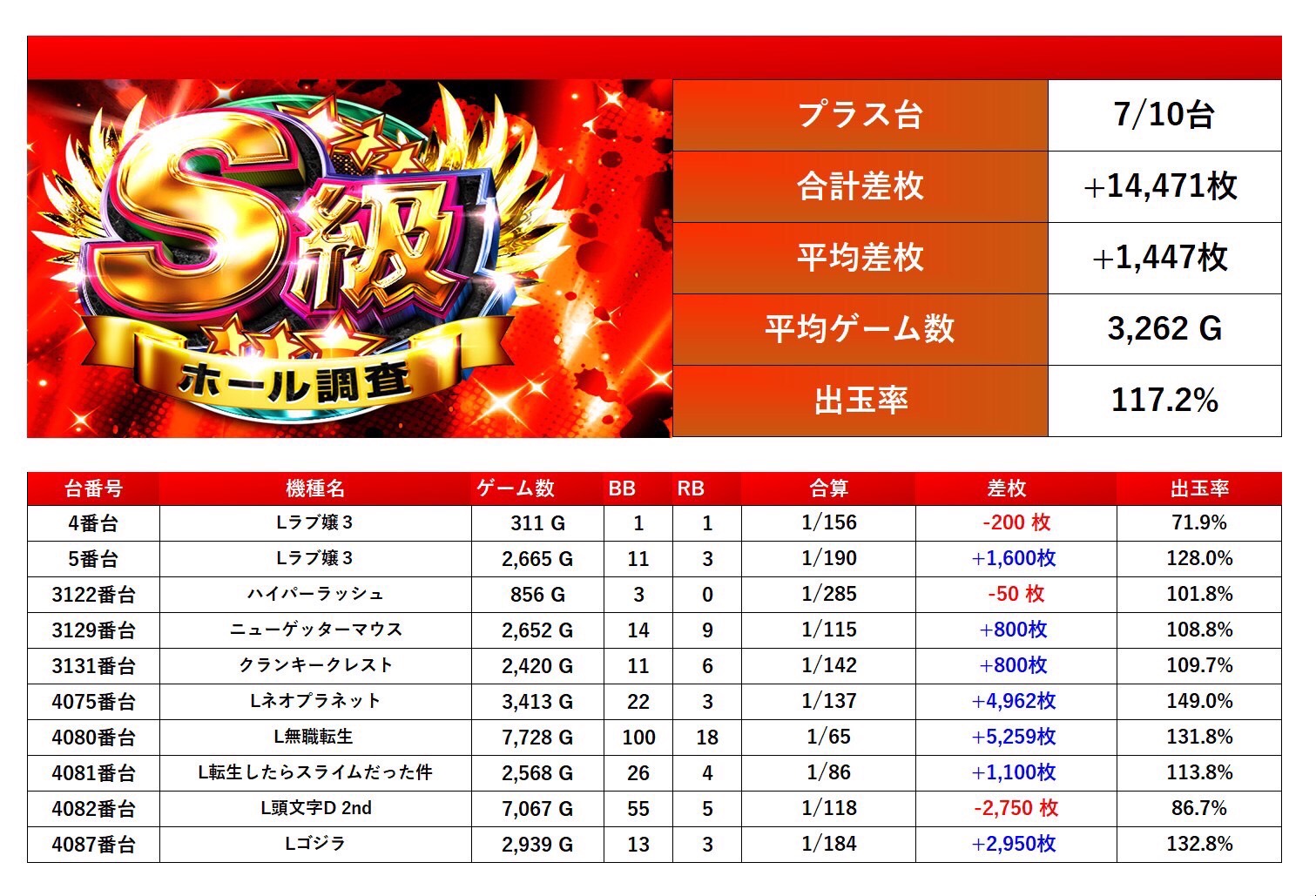 メダル機、スマスロから10台をpick up。10台の平均差枚は+1,447枚で平均出率が117.2%をマーク。新台も織り交ぜ、少数台でありながらも存在感を放っていた。