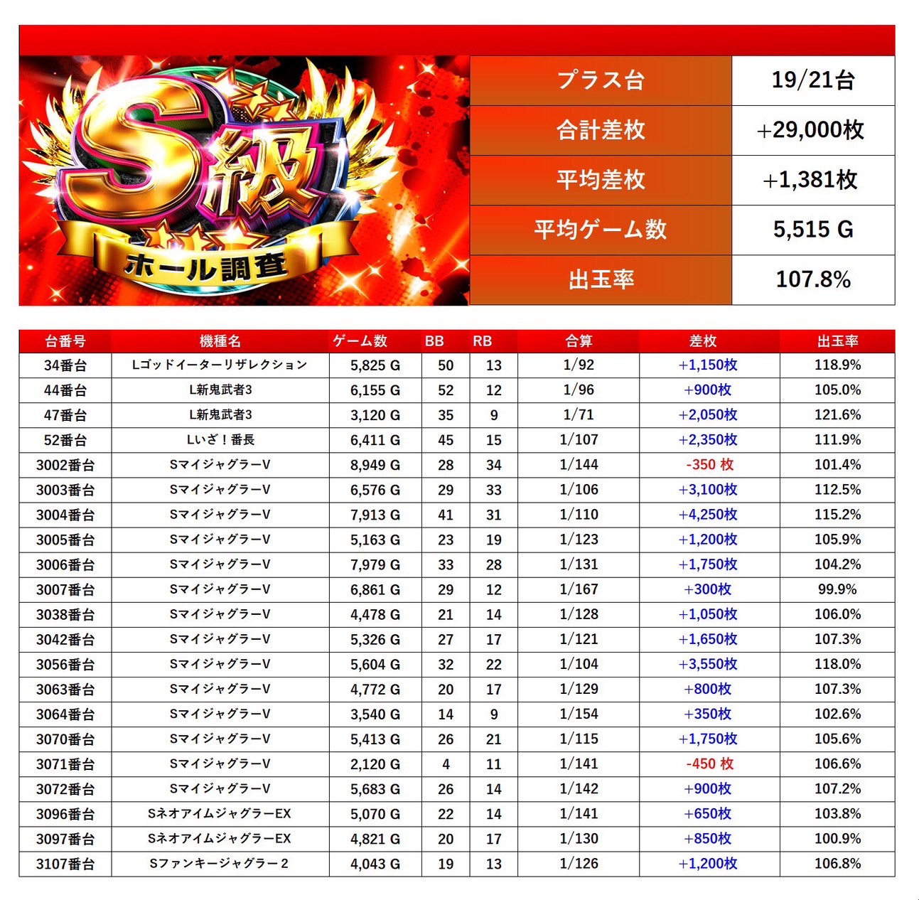 早くも3回目のとなるS級調査は3日振りの開催となった。今回の仕掛けのpick up率は19.8%と圧巻の数値で多彩な仕掛けになっていた。メイン機種では安定した出率を確保し、全台系では前回同様4機種がpick upと多彩な機種を用意してくれていた。ニブイチでもメイン機種、サブ主力機種を織り交ぜた仕掛けで、しっかり打ち込まれていて追える状況だった事が伺える。2台設置機種では新台も対象になっている。少数台ながらも存在感を放ち、ホールの出率を押し上げる要因となっていた。法則に捉われない台からはスマスロ、メダル機からピックアップとなり、過去の傾向からジャグラーシリーズの扱いが良い。バランスが取れた仕掛けになっていて出率も安定していたが、全体で見ると1台当たりの平均が−73枚とあと一歩手が届かず、二つ星評価となった。次回も期待している。