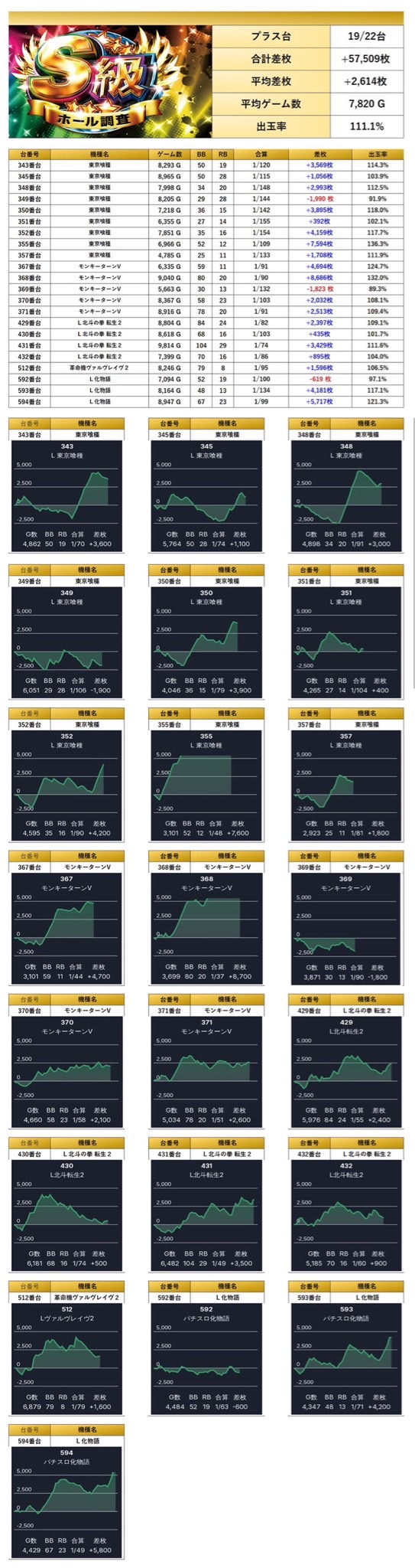 「東京喰種」「ヴヴヴ2」「モンキー」「化物語」「北斗の拳転生の章2」の5機種から22台の優秀台をpick upする。22台の平均差枚は+2,614枚で平均出率が111.1%だった。