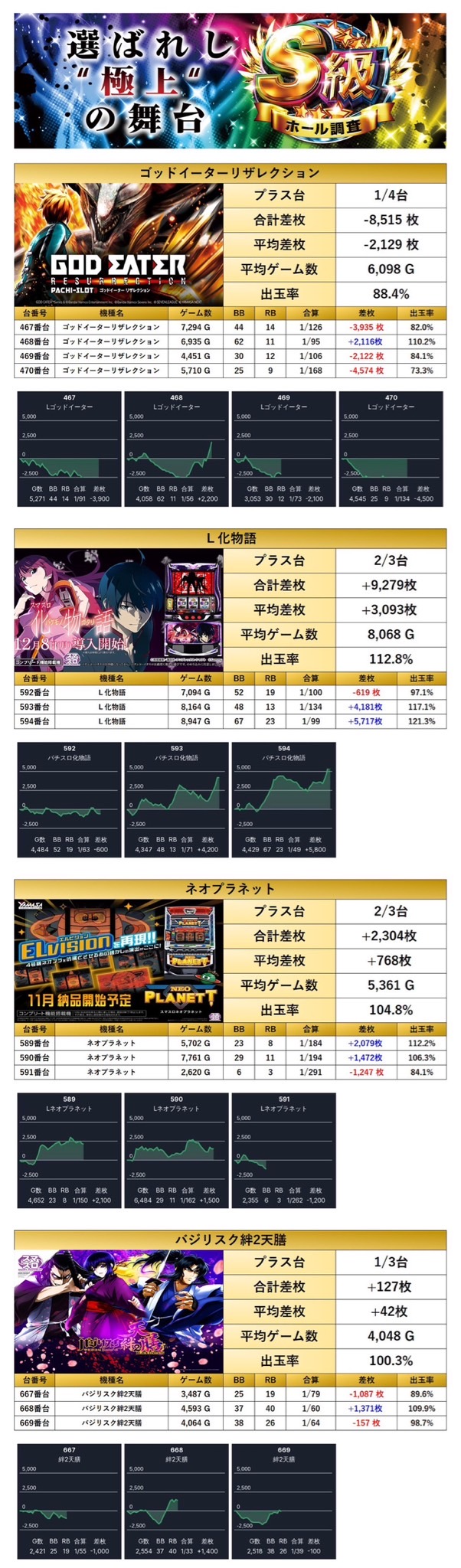 「ゴットイーター」「L化物語」「ネオプラネット」「バジリスク絆天膳」の4機種をpick upする。4機種13台の平均差枚は+264枚で平均出率が103.8%だった。