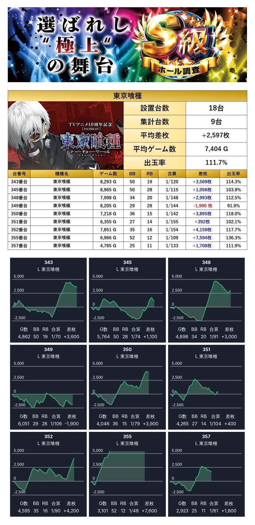 メイン機種でも紹介した「東京喰種」をpick upする。1機種9台の平均差枚は+2,597枚で平均出率が111.7%だった。