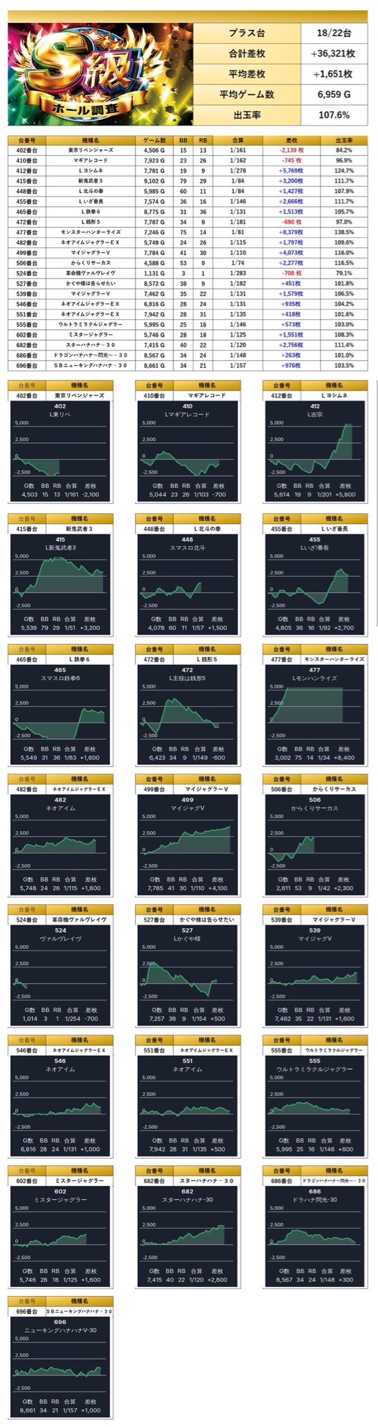 4台以上設置機種から優秀台を探すと22台をpick upすることができた。22台の平均差枚は+1,651枚で平均出率が107.6%だった。