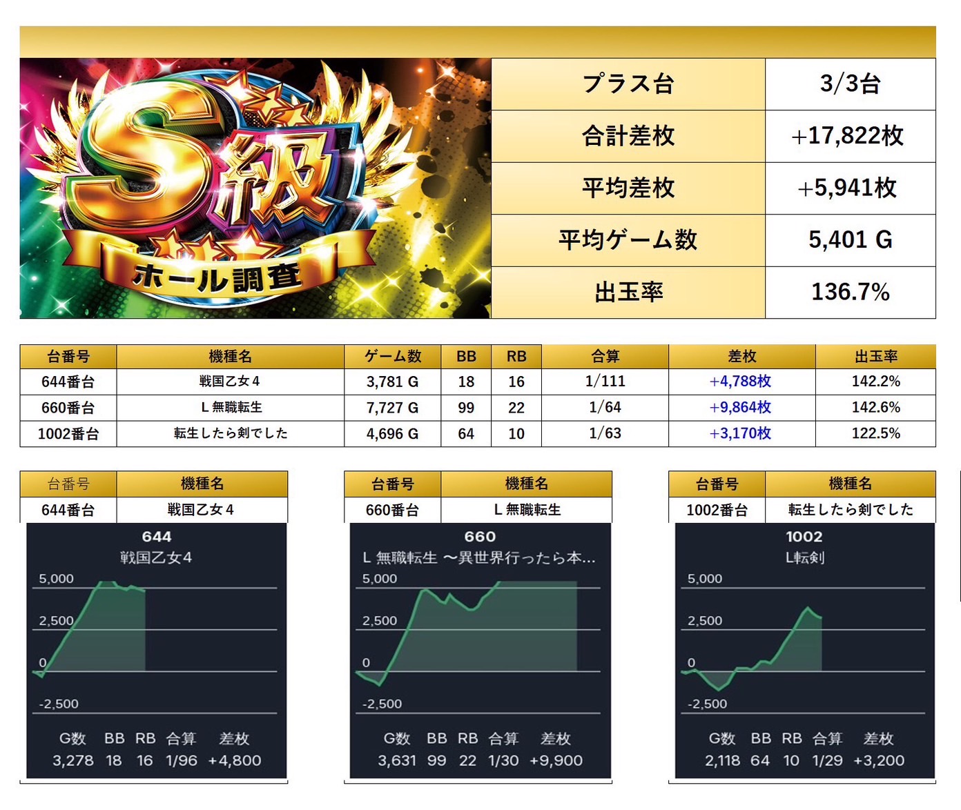 全体から3台をpick upする。3台の平均差枚は+5,941枚で平均出率が136.7%と局所的に爆発力を見せた。
