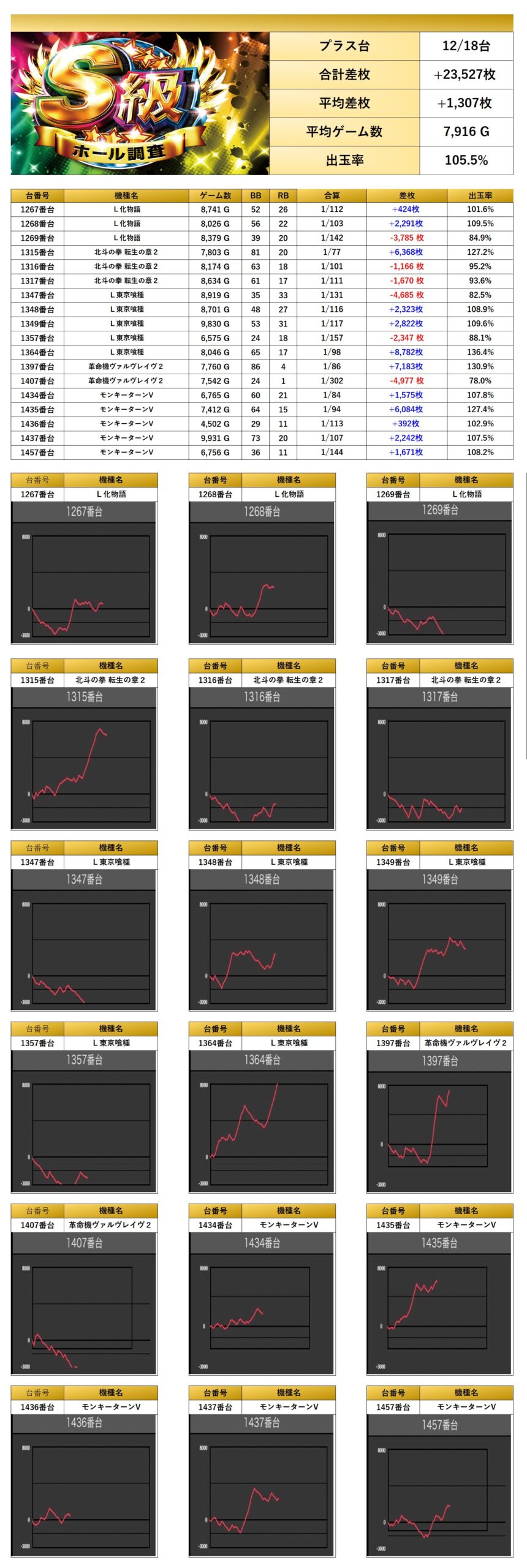 平均差枚は+1,307枚で平均出率が105.5%となり、伸び悩んだ台もあり、少し控えめな出率となった。