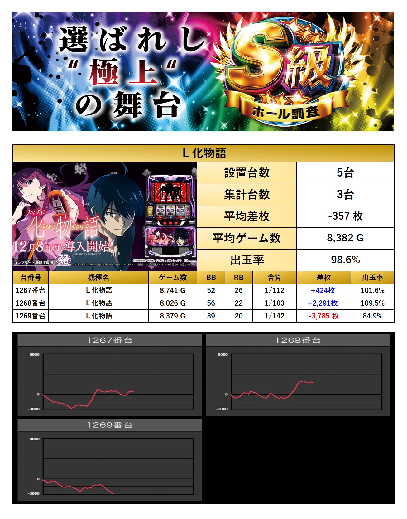 メイン機種でも紹介した「化物語」の1機種をpick upする。1機種3台の平均差枚は−357枚で平均出率が98.6%だった。こちらも伸ばし切れずマイナス域となったが打ち込まれているところを見るに、粘れる状況だった事が伺える。