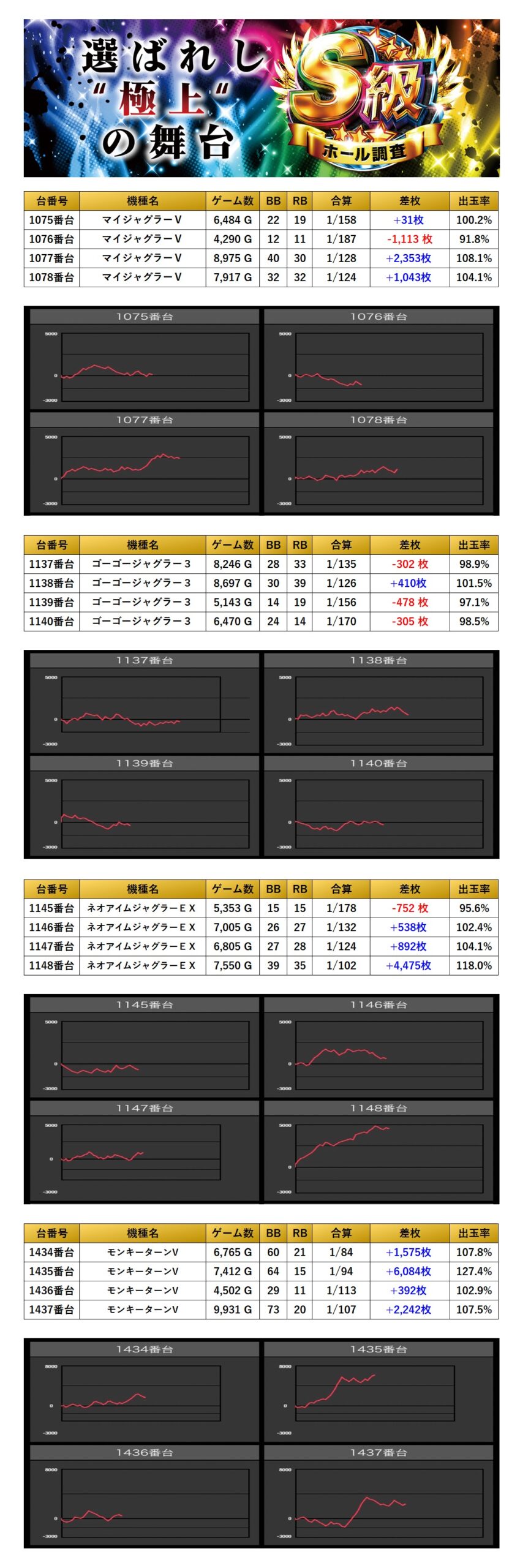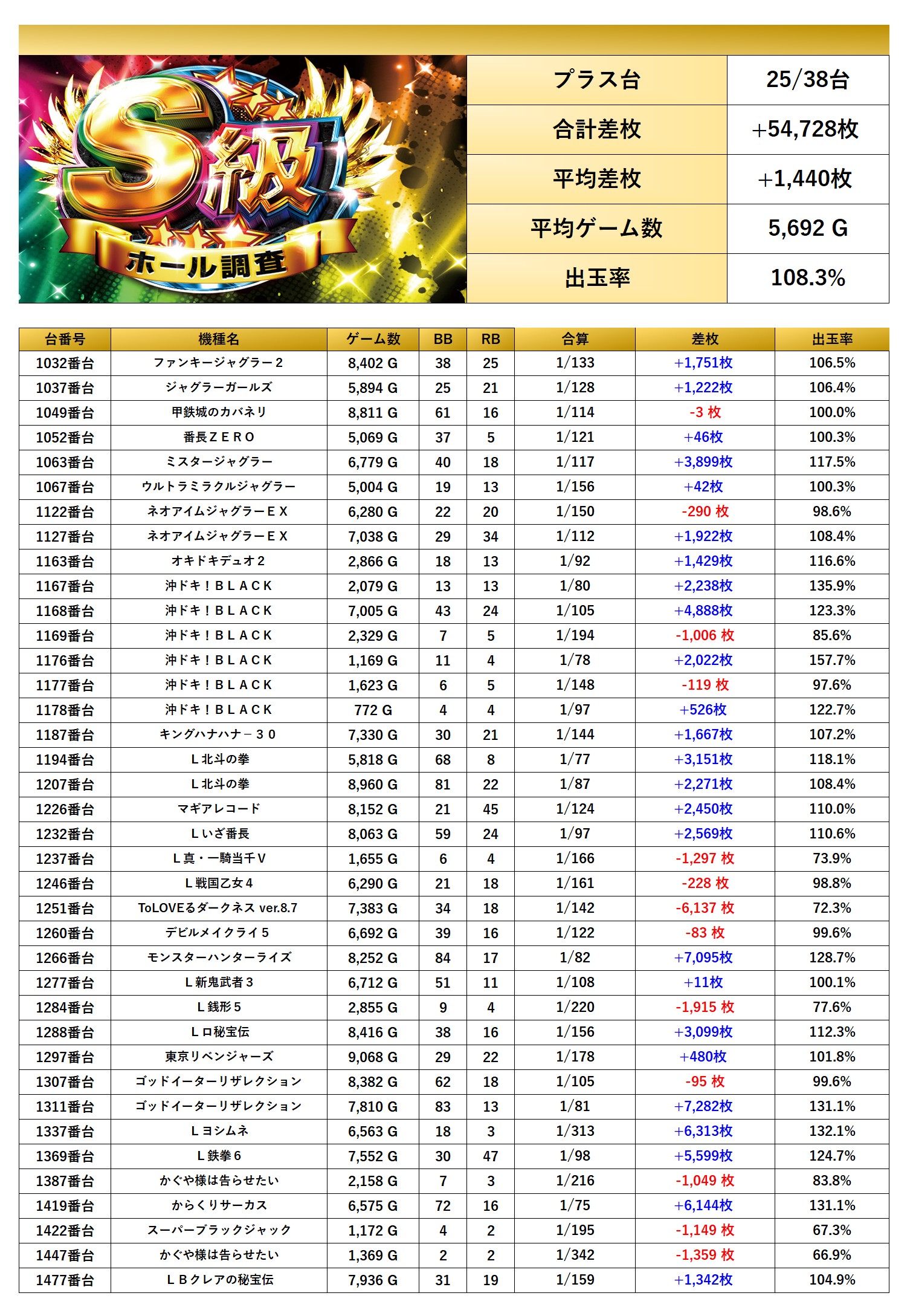 平均差枚は+1,440枚で平均出率が108.3%と多彩な機種が対象になっていた。