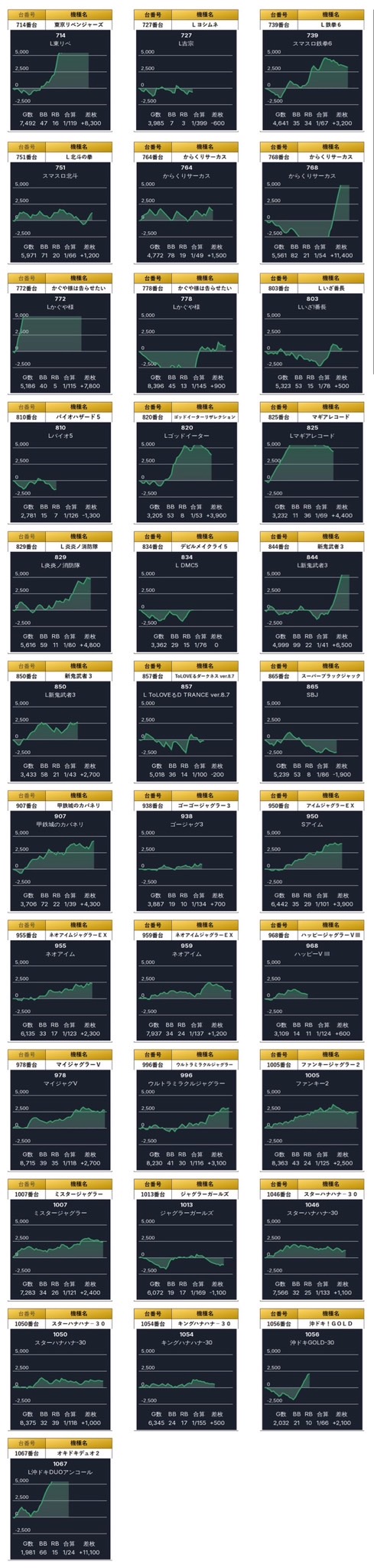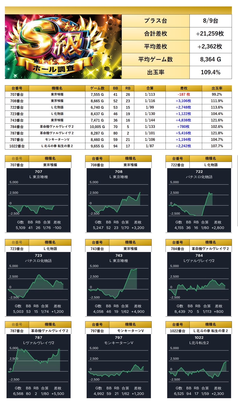 8台の平均差枚は+3,874枚で平均出率が121.0%と多彩な機種が随所で際立っていた。