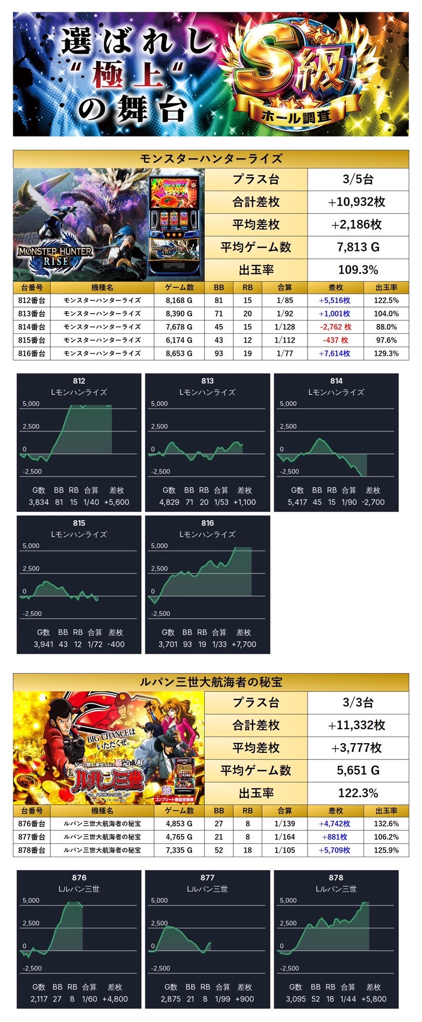 「モンハンライズ」「ルパン三世大航海者の秘宝」の2機種をpick upする。2機種8台の平均差枚は+2,783枚で平均出率が113.2%と圧巻の出率でインパクトを与えた。