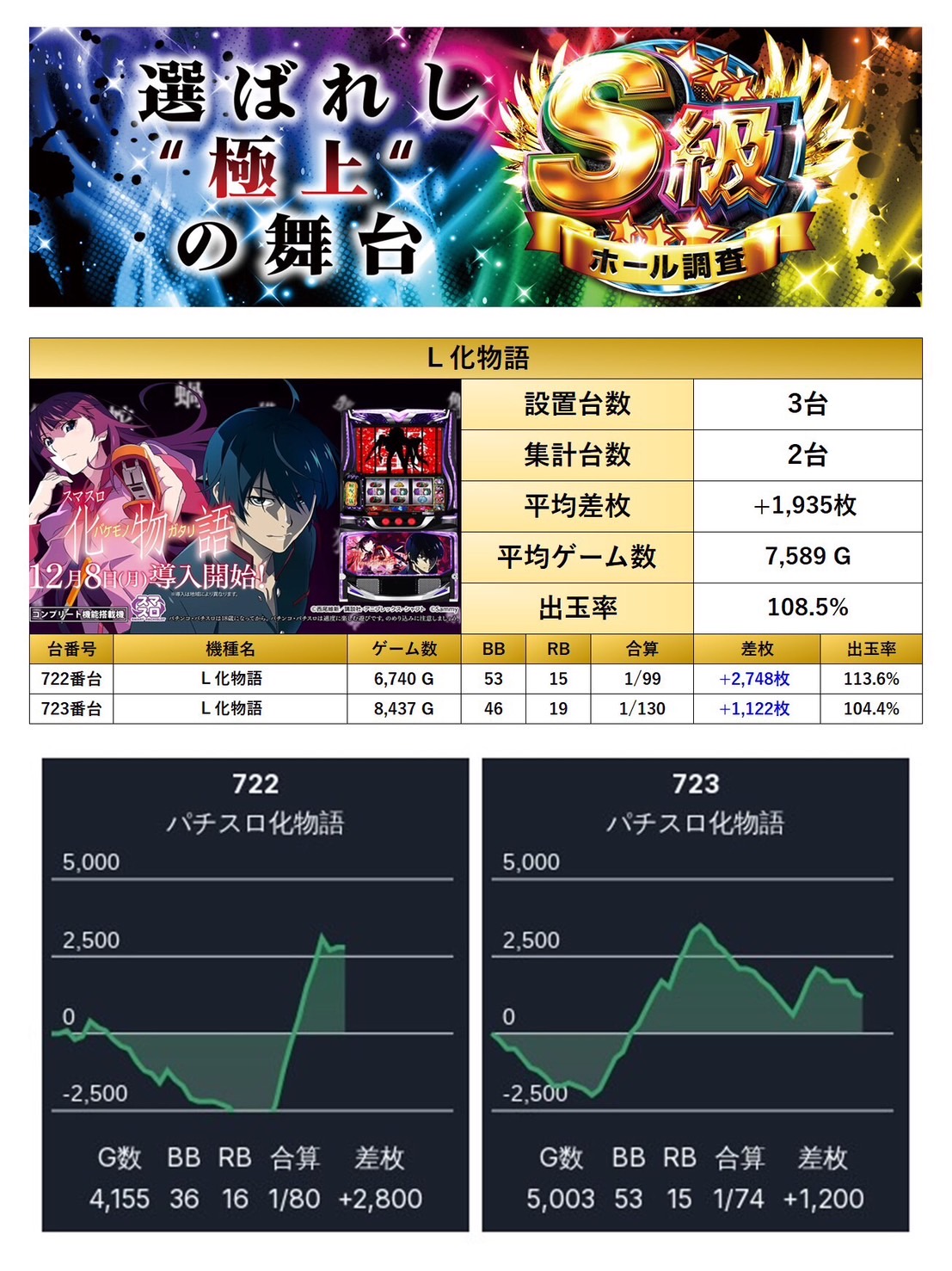 メイン機種でも紹介した「化物語」の1機種をpick upする。1機種2台の平均差枚は+1,935枚で平均出率が108.5%となっていた。