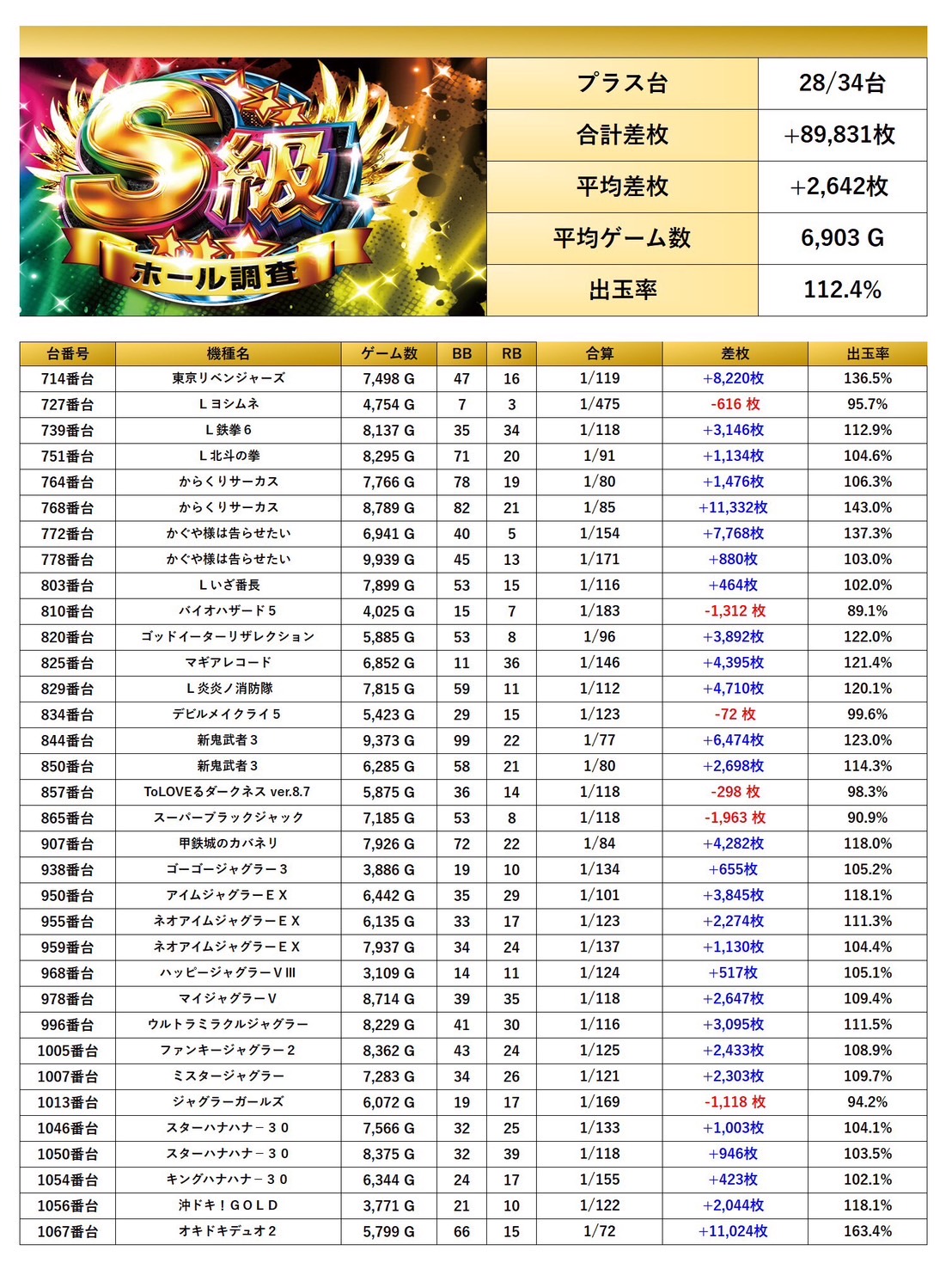 平均差枚は+2,244枚で平均出率が110.8%と対象になった全台がプラスとなり、出率も素晴らしく並びらしい視覚的盛り上がりを見せていた。