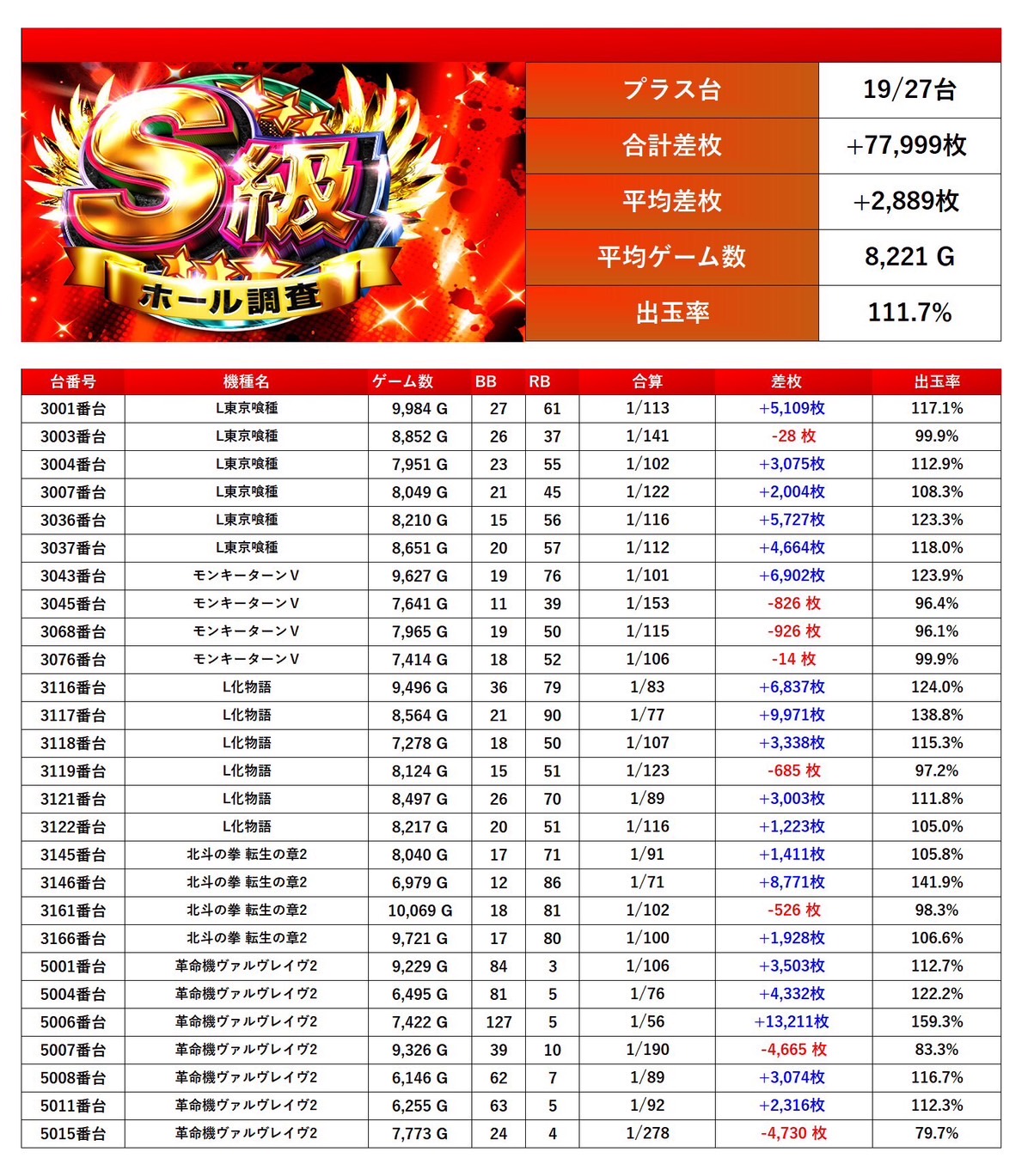 「東京喰種」「モンキー」「ヴヴヴ2」「化物語」「北斗の拳転生2」のメイン主力機種から27台pick upする。27台の平均差枚は+2,889枚で平均出率が111.7%と出率はメイン機種らしい安定した結果になった。