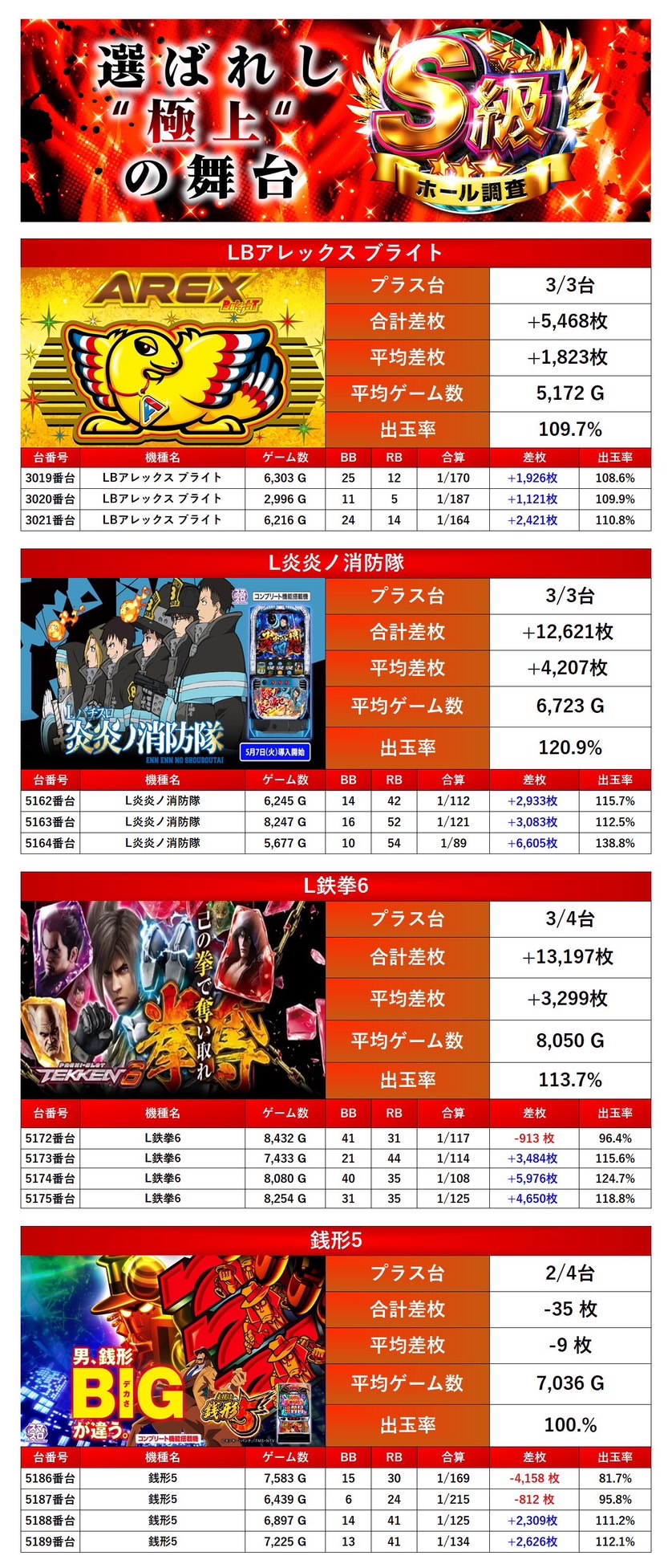 「アレックスブライト」「L炎炎ノ消防隊」「L鉄拳6」「銭形5」の4機種をpick upする。4機種14台の平均差枚は+2,232枚で平均出率が110.5%と多彩な機種がpick upされ出率も素晴らしかった。