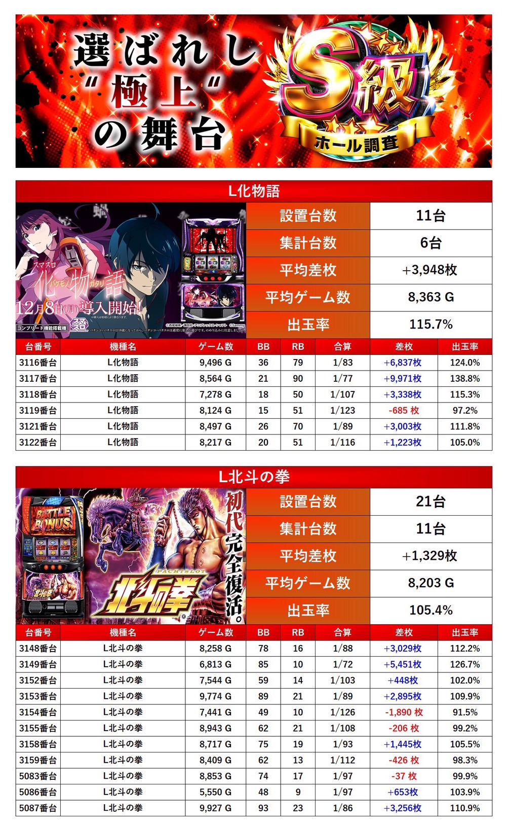 最優秀台でも紹介した「化物語」さらには「L北斗の拳」の2機種をpick upする。2機種17台の平均差枚は+2,253枚で平均出率が109.1%と盛り上がりを見せていた。