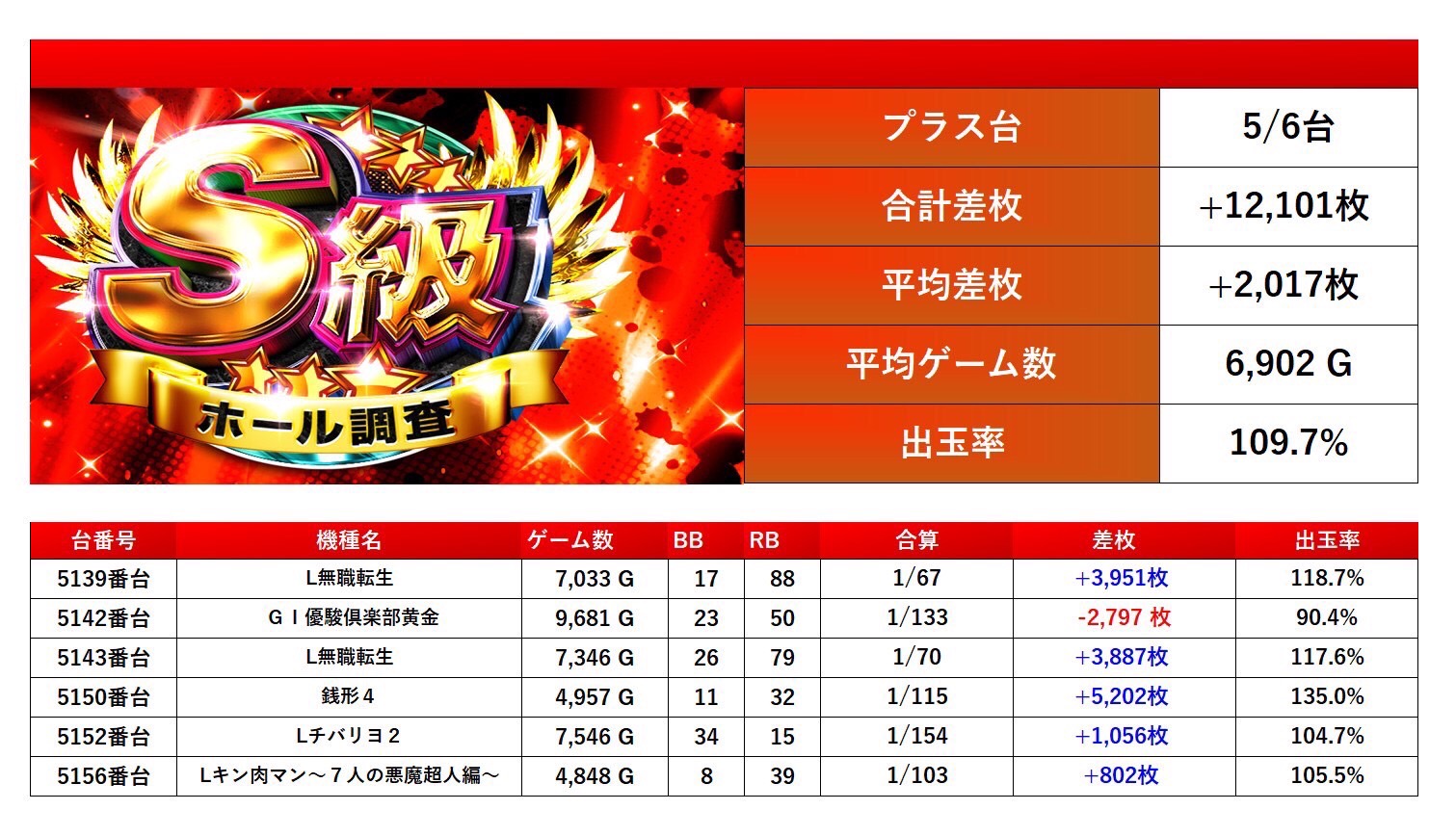 メダル機、スマスロから6台をpick upする。6台の平均差枚は+2,017枚で平均出率が109.7%だった。