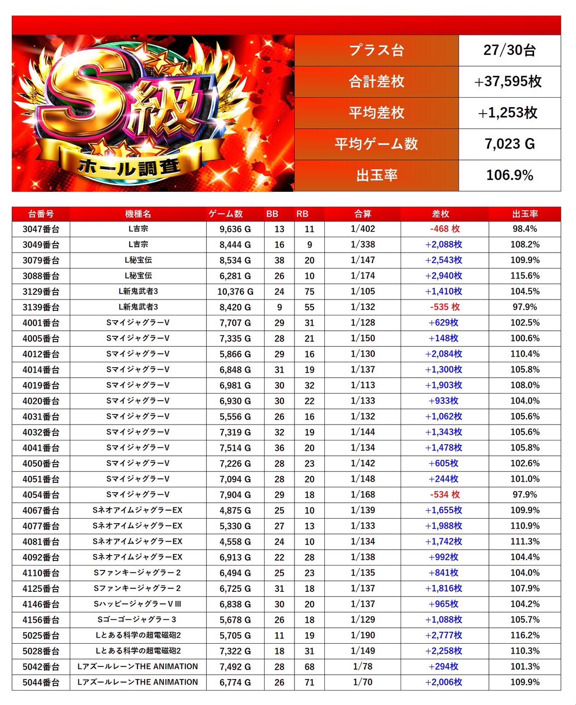 メダル機、スマスロから30台をpick upする。30台の平均差枚は+1,253枚で平均出率が106.9%だった。