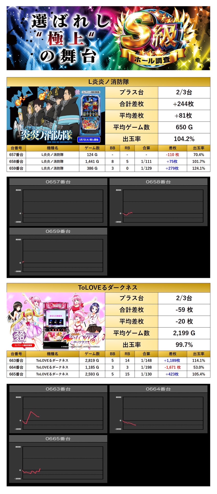 5回目の開催となったS級虹では抽選148名/一般46名と大勢のユーザーが足を運んでくれた。仕掛け全体を見ると15.2%となっていた。目を見張るのは「メイン機からの仕掛け」では今回から新台の北斗の拳も対象になり、メイン機種らしい盛り上がりと出率を誇っていた。「全台が好調だった機種」では打ち込みが足らず、ポテンシャルを発揮できずに終わった。「設置の半分が好調だった機種」ではしっかりとメリハリが効いており、対象の台は圧巻の出率で勝率も高かった。「4台設置機種の仕掛け」では30台も対象となり、随所に仕掛けが散りばめられており、対象機種も人気機種がしっかり選ばれていてチャンスはどこにでもあった。今回の調査では分岐に届かず、結果は二つ星評価となった。次回も期待している。