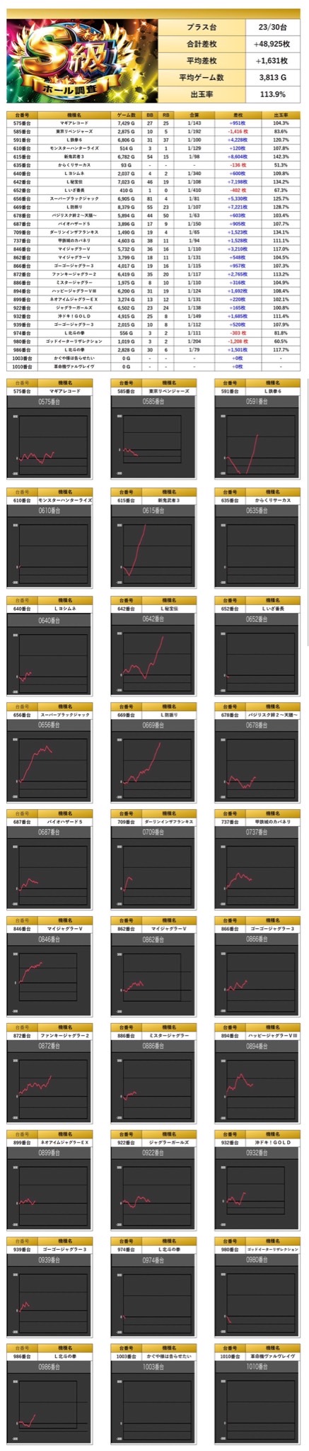 平均差枚+1,631枚、平均出率113.9%と、スマスロ、メダル機から多彩な機種が対象に。