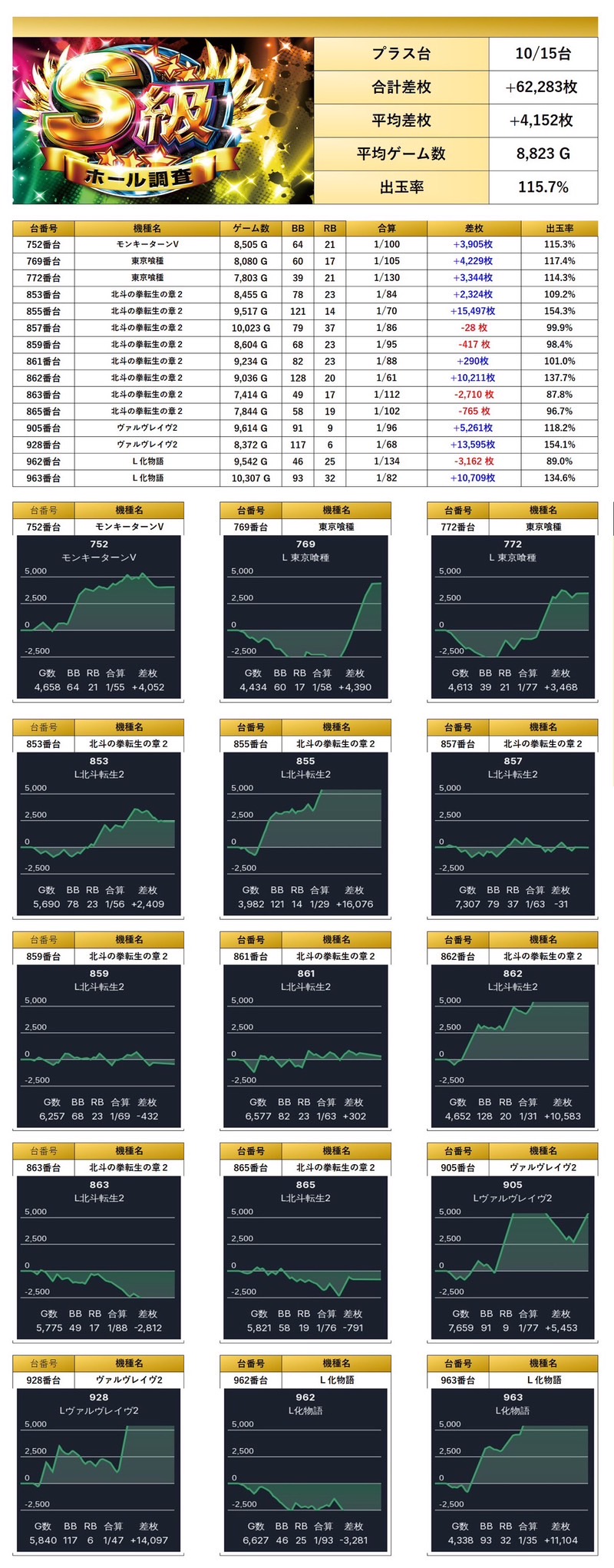 ピックアップした合計15台の平均差枚は+4,152枚で平均出率115.7%となりメイン機種の爆発力と安定感を見せつけた。