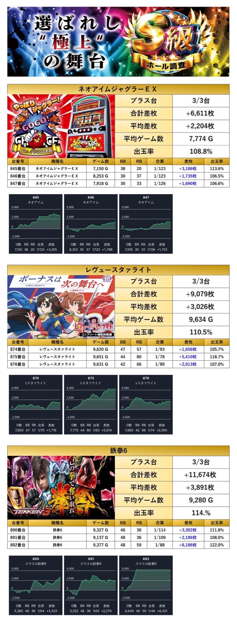 平均差枚は+3,040枚で平均出率111.1%と全台がプラスと、質の高さでユーザーを魅了した。