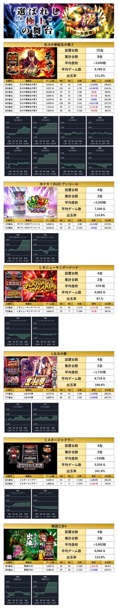 「北斗の拳転生2」「沖ドキ!DUOアンコール」「ニューキングハナハナ」「L北斗の拳」「ミスタージャグラー」「戦国乙女4」の6機種18台をピックアップ。