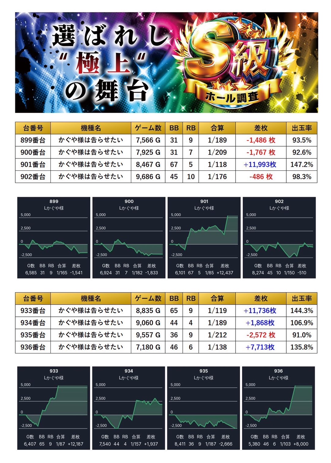 ピックアップした8台の平均差枚は+3,375枚で平均出率113.2%とかぐや様は告らせたいが対象になっており、下振れした台も見られるが、しっかりとプラス域を確保。