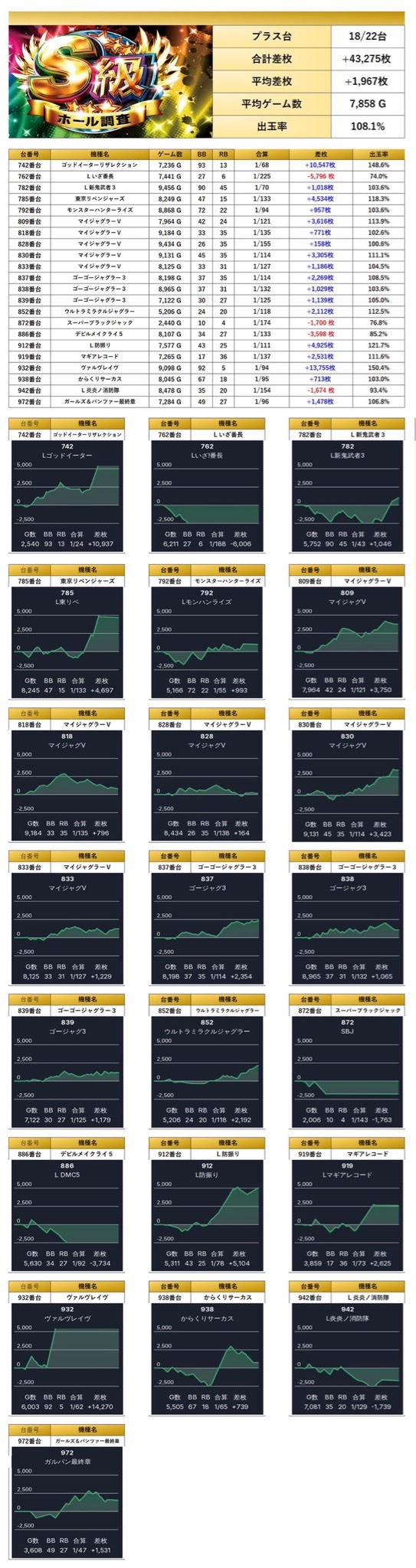 平均差枚は+1,967枚で平均出率108.1%となり、メイン機以外も幅広く狙える環境だった。