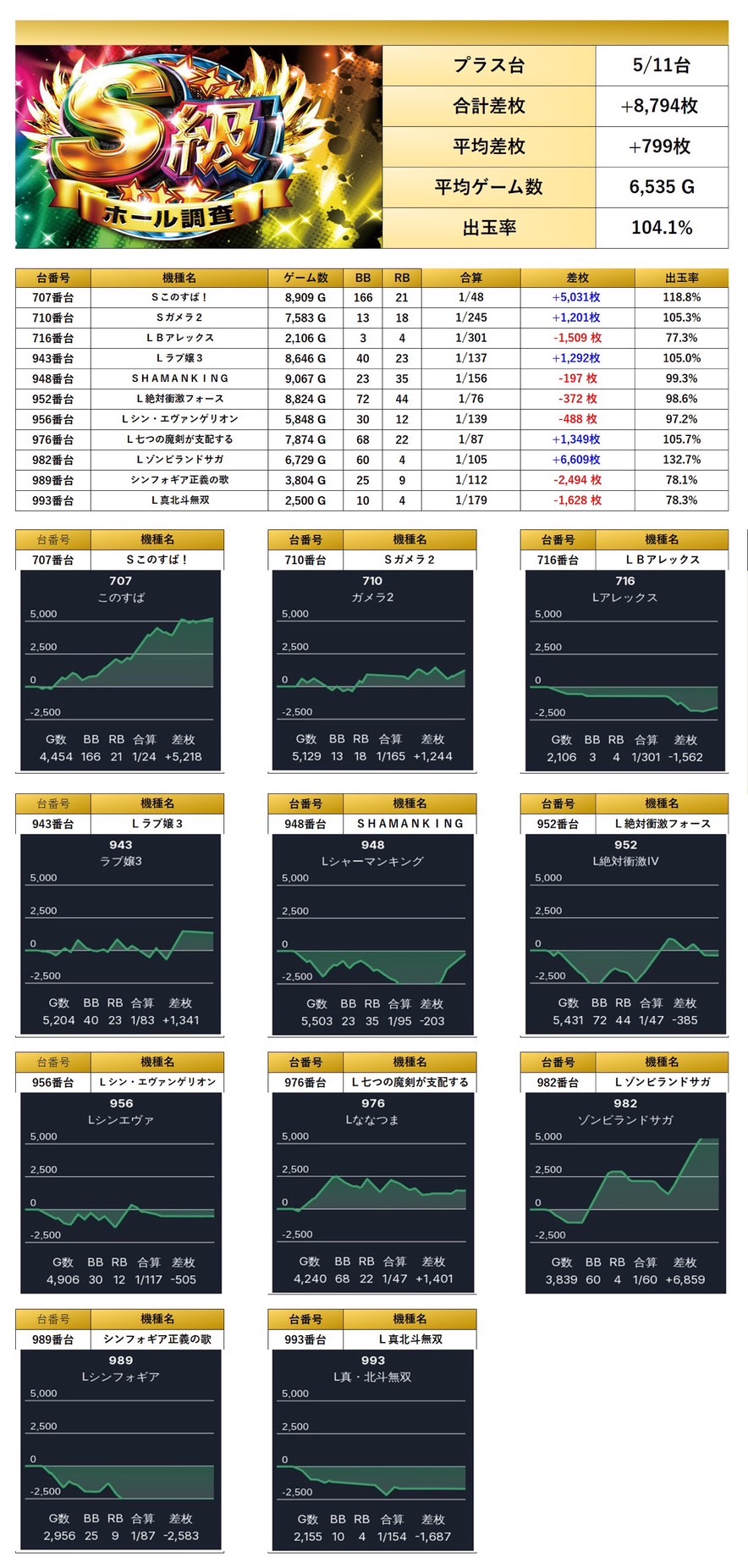 平均差枚は+799枚で平均出率104.1%となり、局所的な盛り上がりも見せていた。