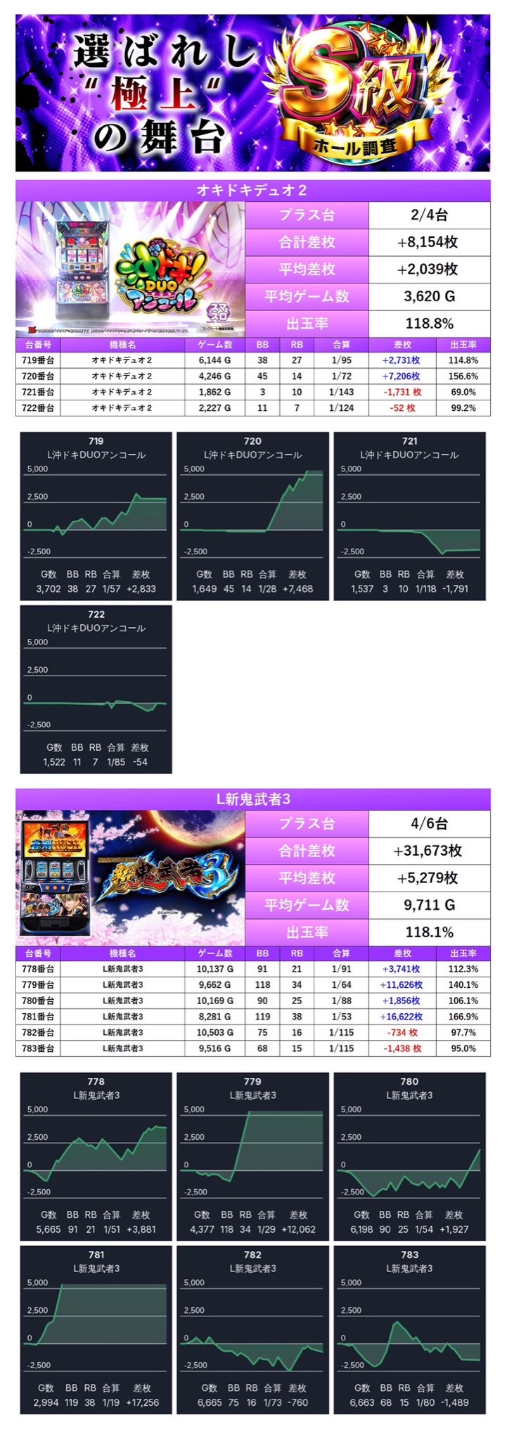 対象は「沖ドキ!DUOアンコール」「新鬼武者3」2機種10台で、平均差枚+3,983枚/出率118.2%と出率は圧巻で抜群の反応を示し、盛り上がりを演出。