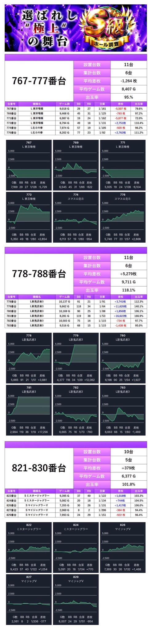 767~777番台、778~788番台、821~830番台の3箇所がpick upされた。平均差枚+1,528枚/出率106.1%と列全体でまとまった出玉感を演出した。