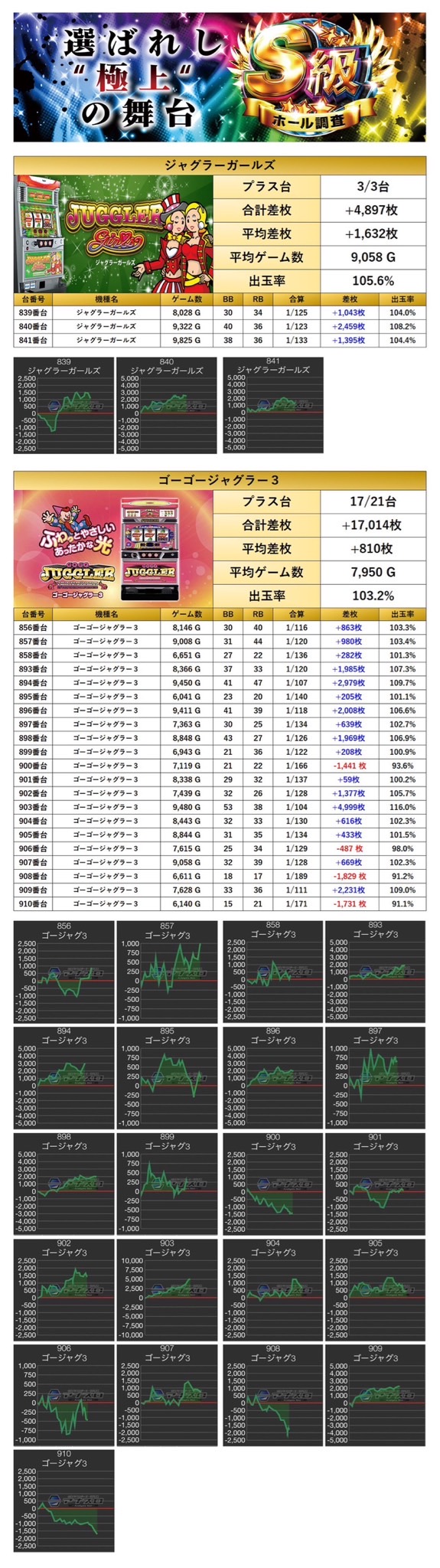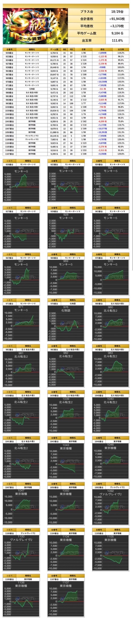 平均差枚+3,170枚、平均出率111.6%となった。多数の台がしっかり打ち込まれており、万回転が6台もあり、平均ゲーム数が9000G超えと勝率も素晴らしい結果に。