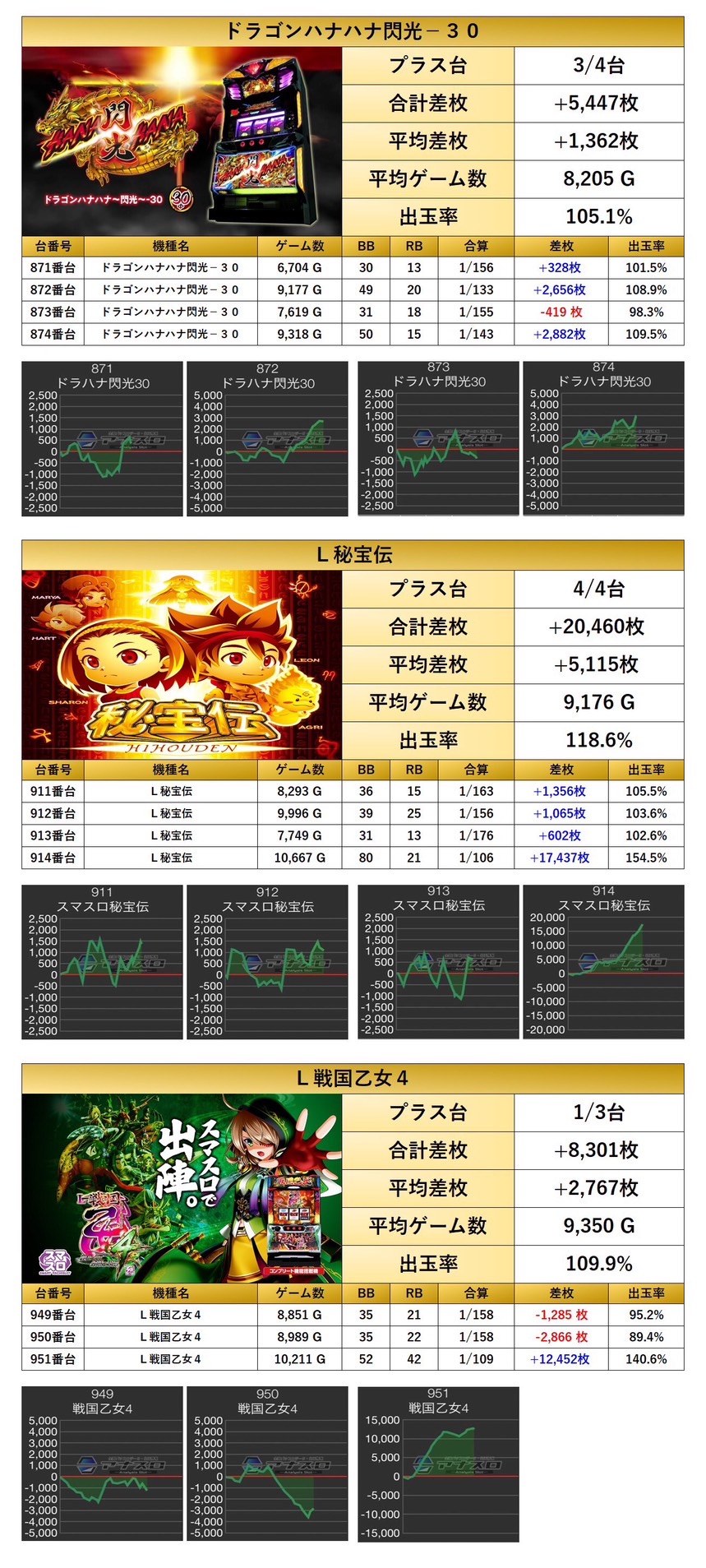 「ジャグラーガールズ」「ゴーゴージャグラー」「ドラゴンハナハナ-30」「L秘宝伝」「L戦国乙女4」の5機種35台をpick up。