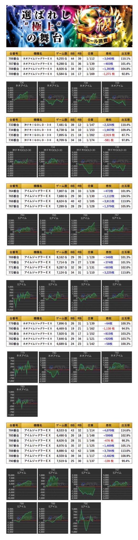 10回目となったS級‐虹‐は設置台数388台に対して、抽選388名/一般157名と設置台数を超えるユーザーが集まってくれた。今回のpick up率は前回を上回る35.5%と驚愕の数値で、圧巻の仕掛け量になっていた。