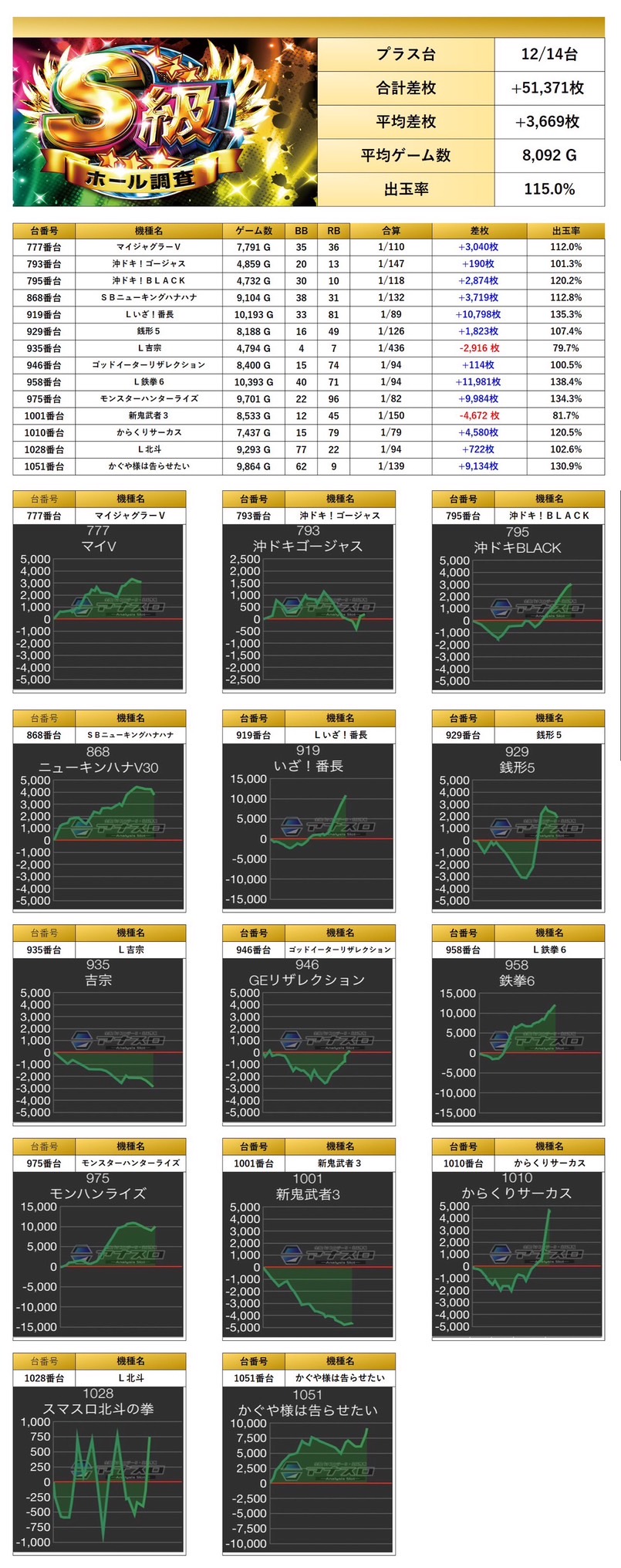 平均差枚+3,669枚、平均出率115.0%と12/14がプラスと質も高く、素晴らしい出率となった。