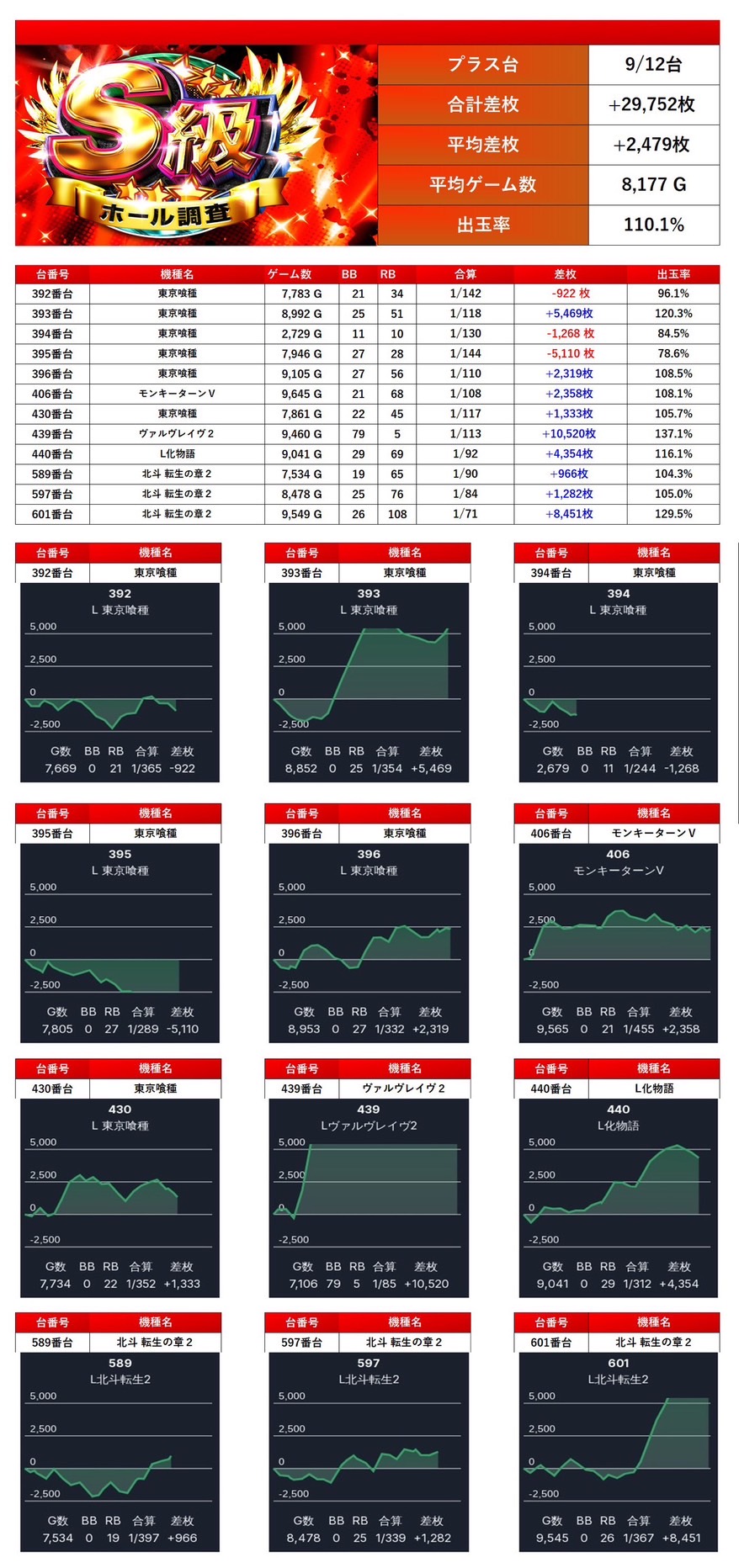 合計12台の平均差枚は +2,479枚、平均出率は 110.1% とメイン機種らしい圧巻の出率を誇った。