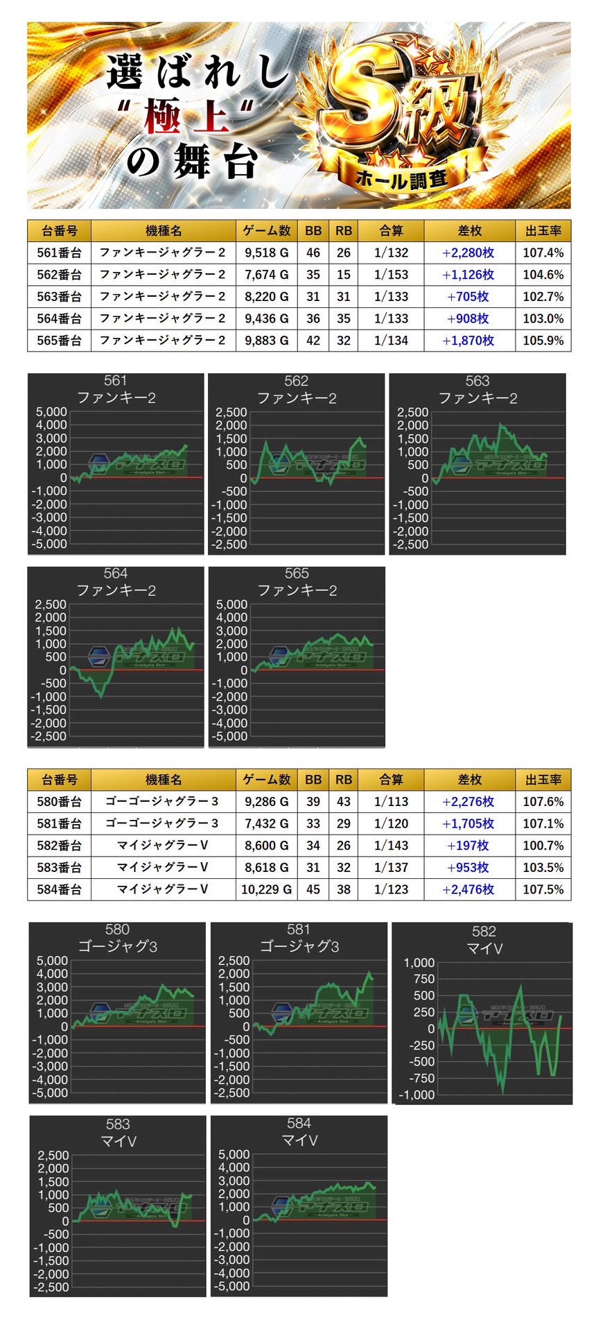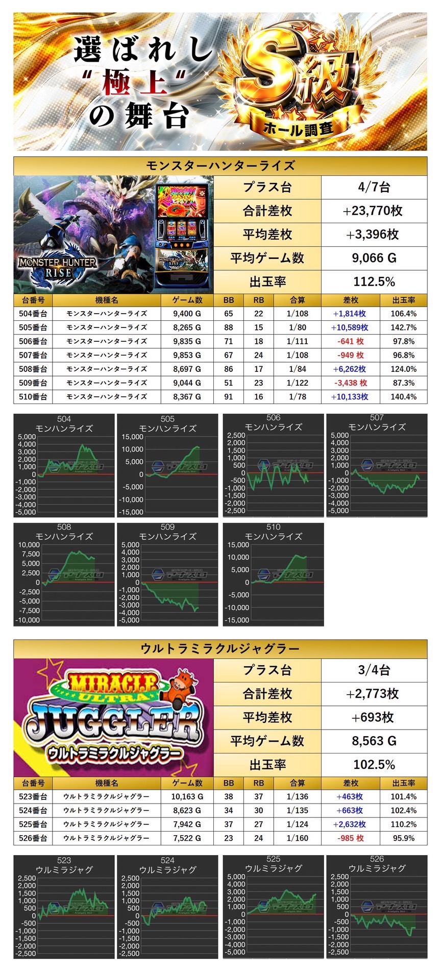 「モンハンライズ」「ウルトラミラクルジャグラー」の2機種計11台がピックアップされ、平均差枚+2,413枚/出率108.8%とこちらも安定した出率でしっかり出玉を確保している。