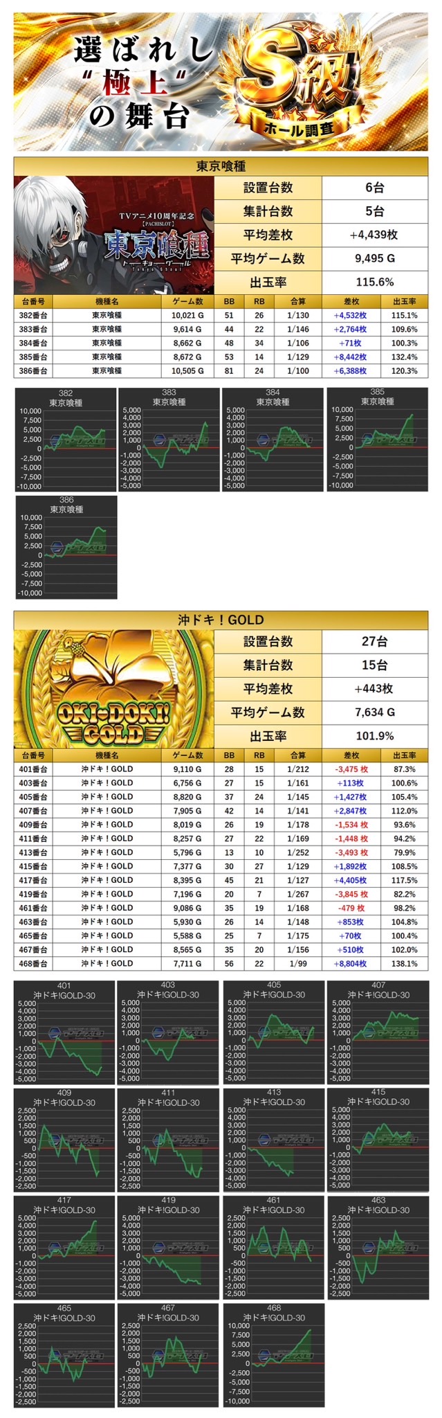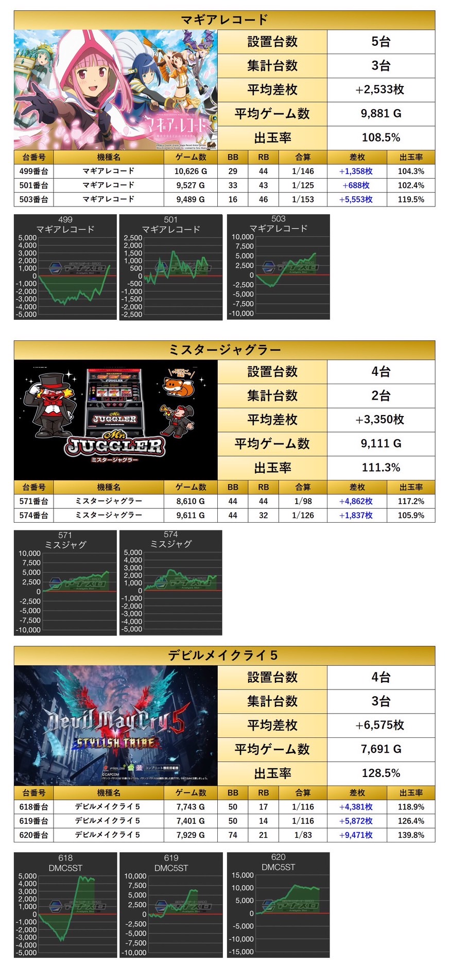 「東京喰種」「沖ドキ!GOLD」「マギレコ」「ミスタージャグラー」「デビルメイクライ5」の5機種から計28台をピックアップ。