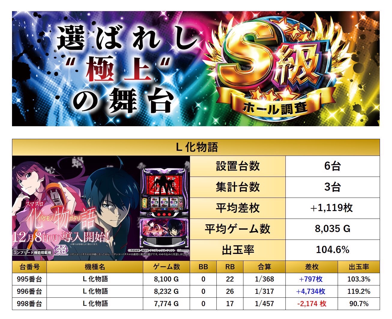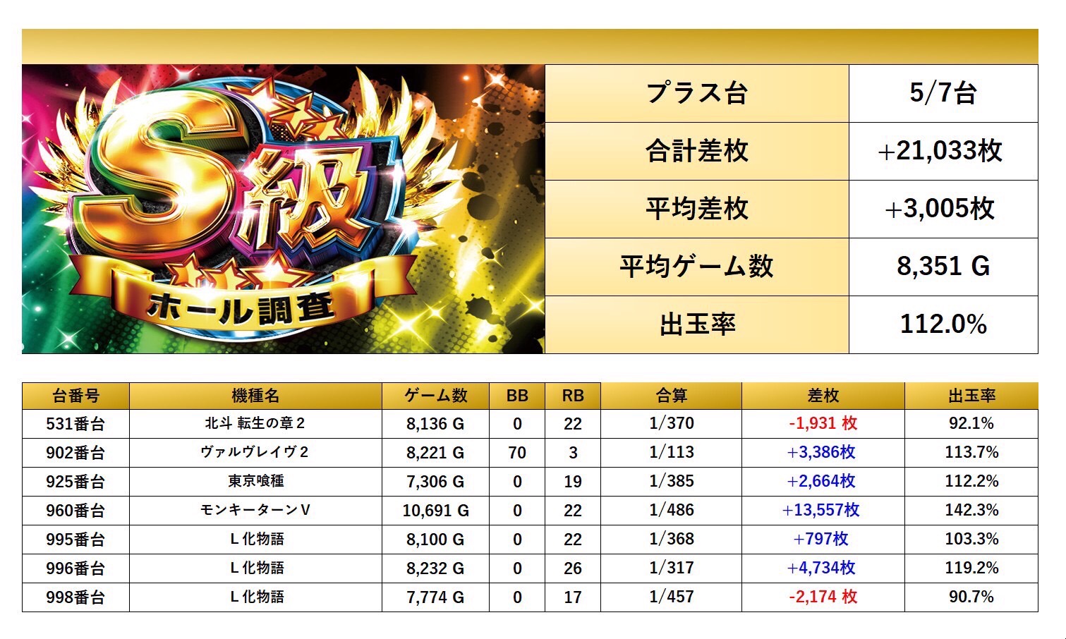 平均差枚+3,005枚、平均出率112.0%とメイン機種らしい圧巻の出率をマークした。