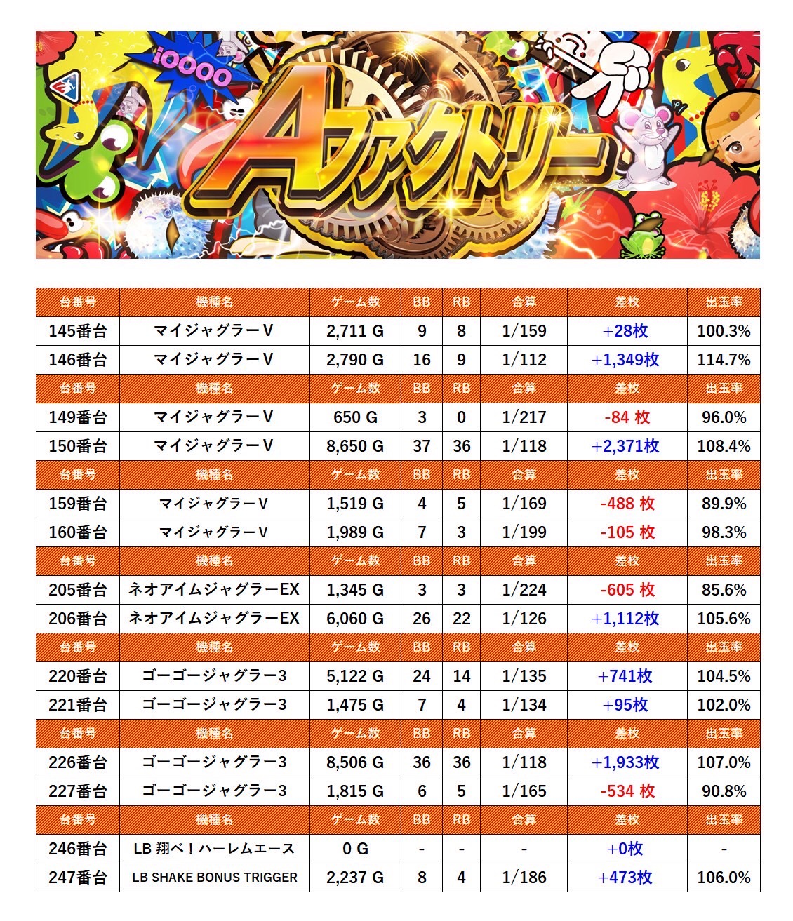 ・集計機種計14台総差枚数:+6,286枚
