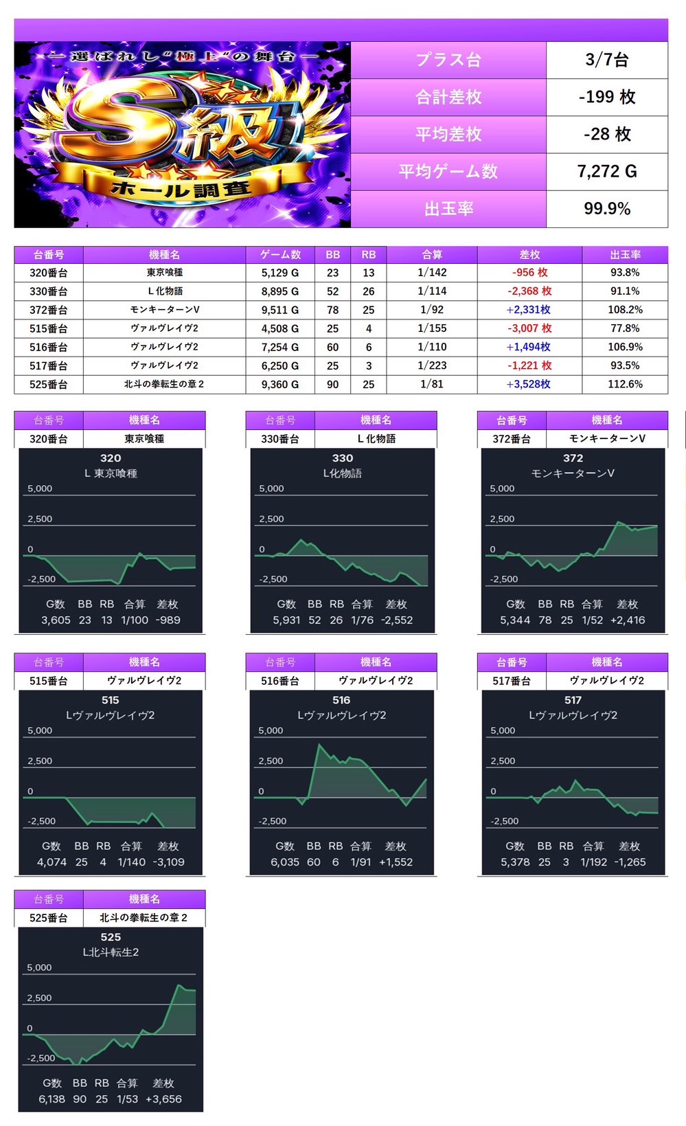 ピックアップした合計7台の平均差枚は−28枚で平均出率99.9%と伸び悩み控えめな結果となった。