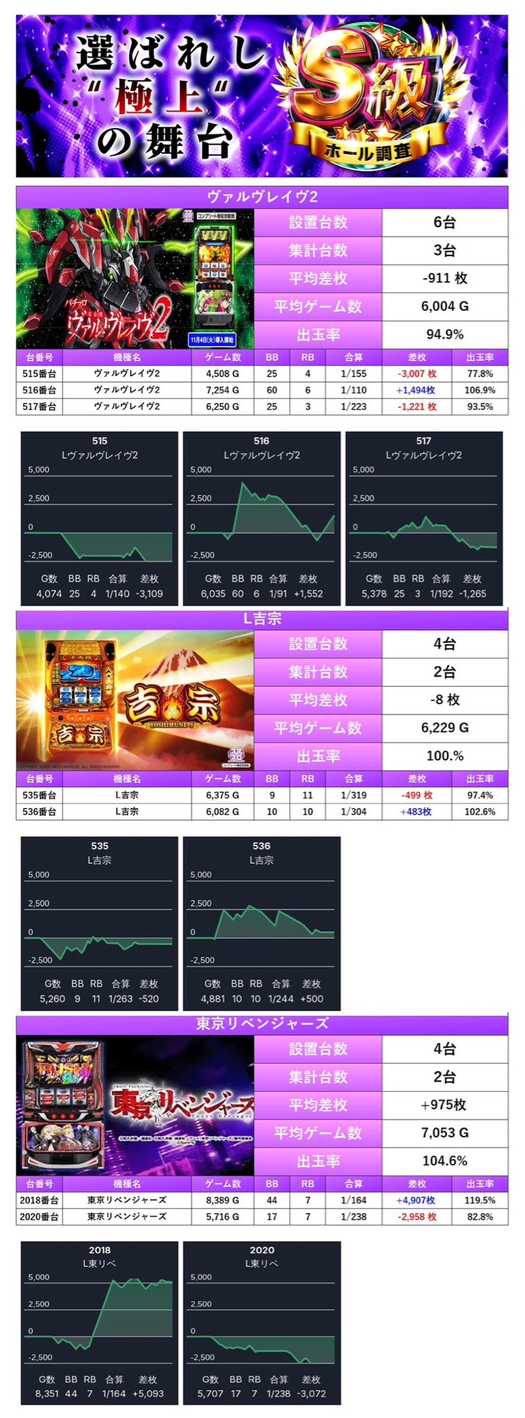 「ヴァルヴレイヴ2」「モンハンライズ」「L吉宗」「東京リベンジャーズ」の4機種7台をピックアップ。